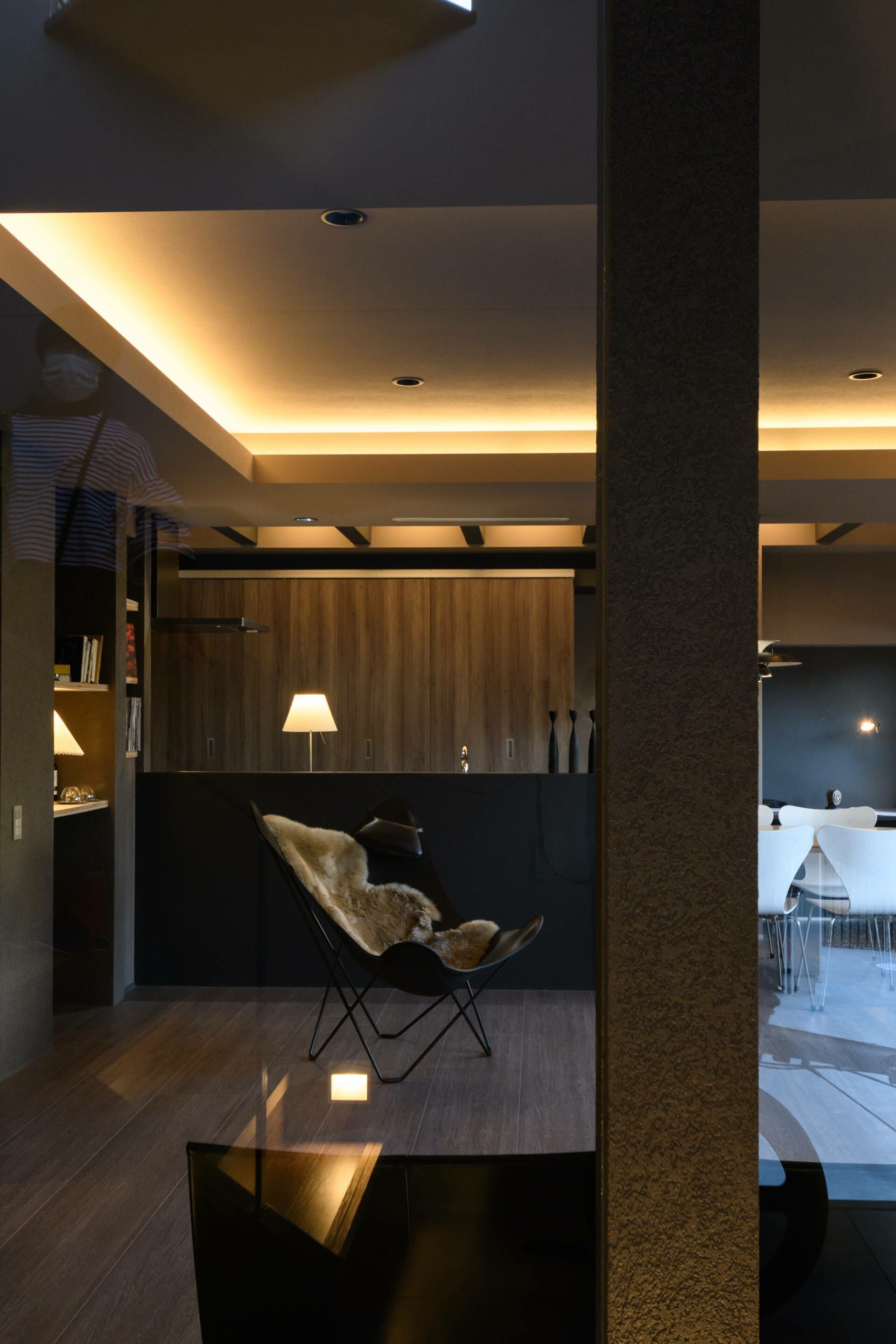ビルトインガレージ付きの住宅になります。グレージュをベースに木目と間接照明、ガラスを組み合わせて気品あるインテリアと明暗が空間を構成する設計を行いました。LDKはガラスで仕切り玄関、階段、廊下を視覚的に取り込み間接照明を各所に取り入れ広がりを感じれることができる様に設計の工夫をしています。