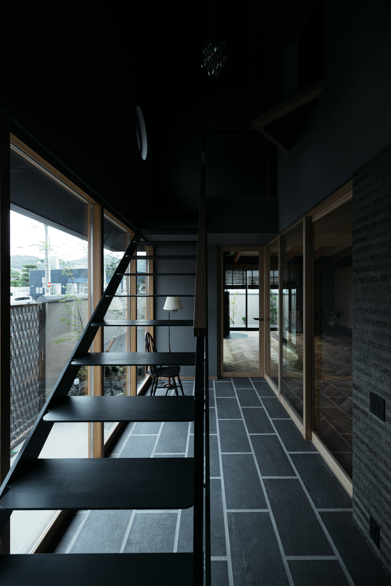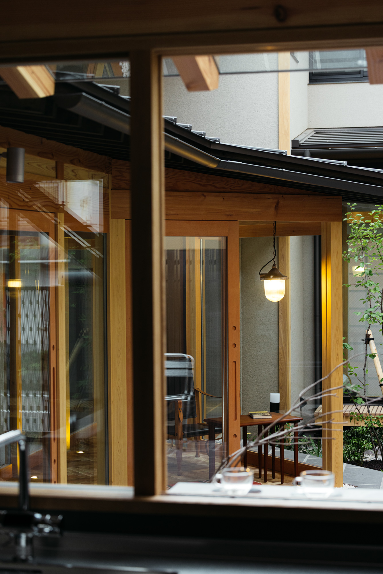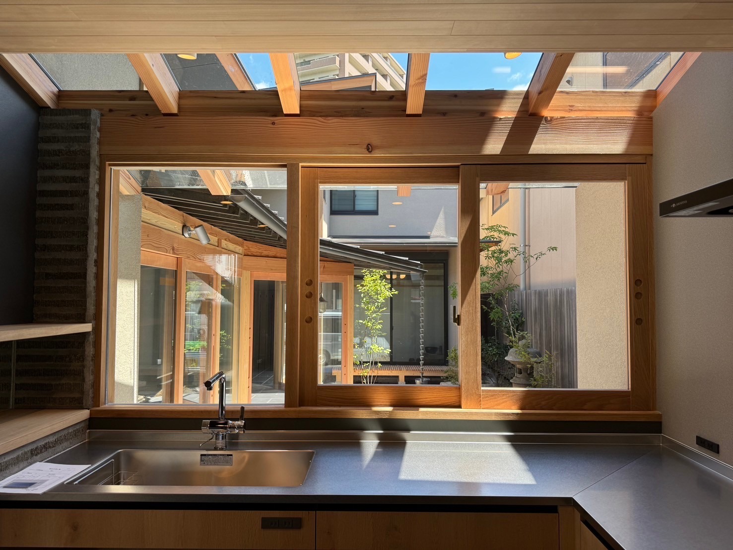 そしてキッチンから眺められる中庭はとてもい気持ちよさそうな場所。このキッチンはオーダーキッチンでインテリアに合わせてオークとグレー、ブラックで色合いをまとめてみました。