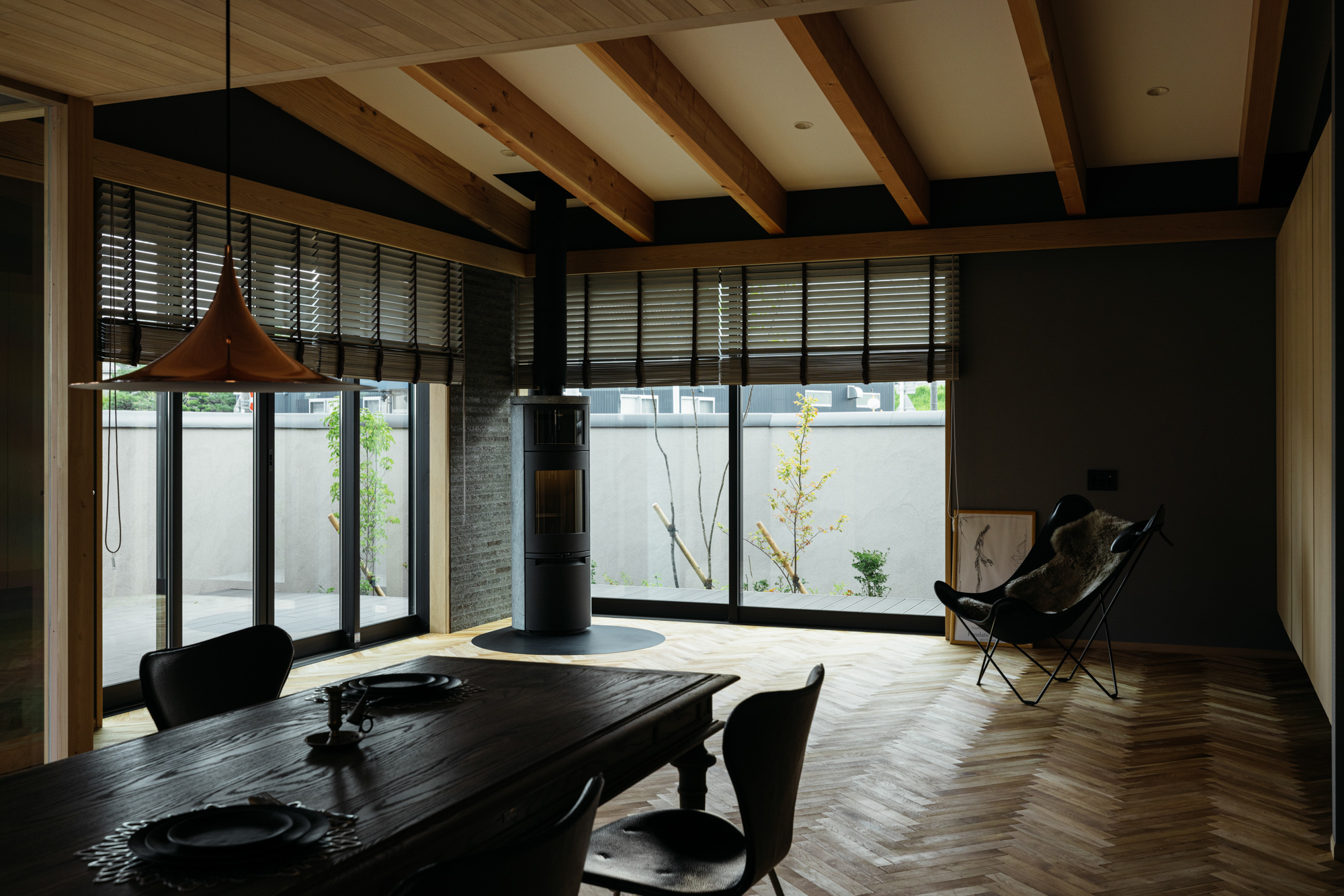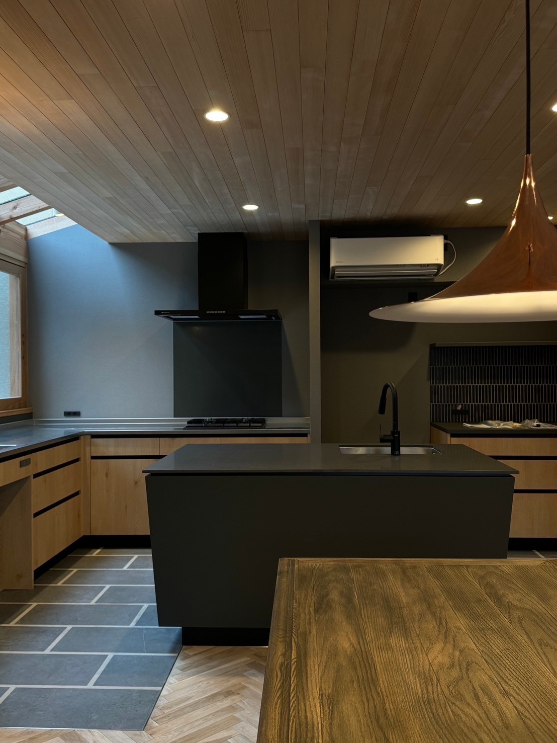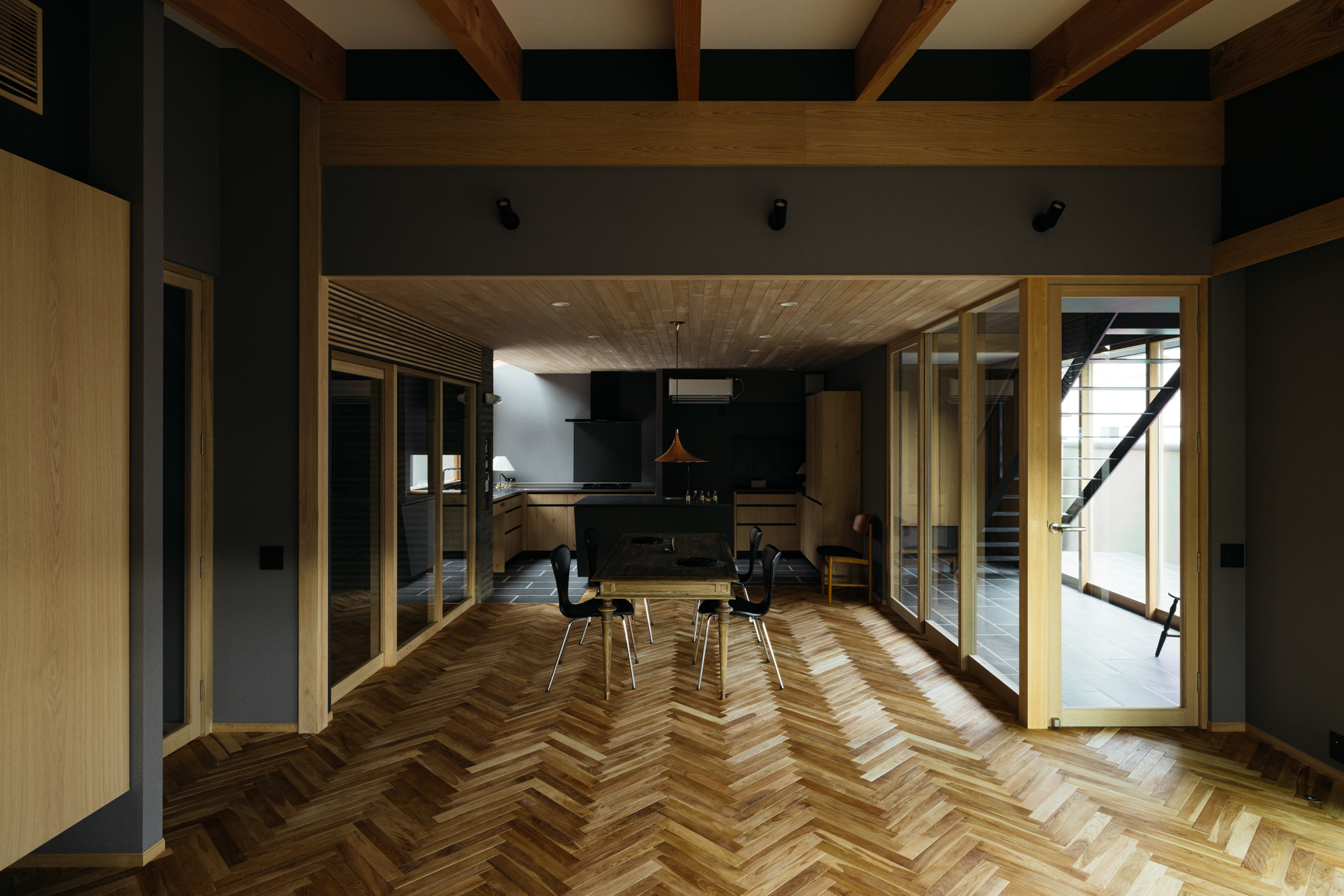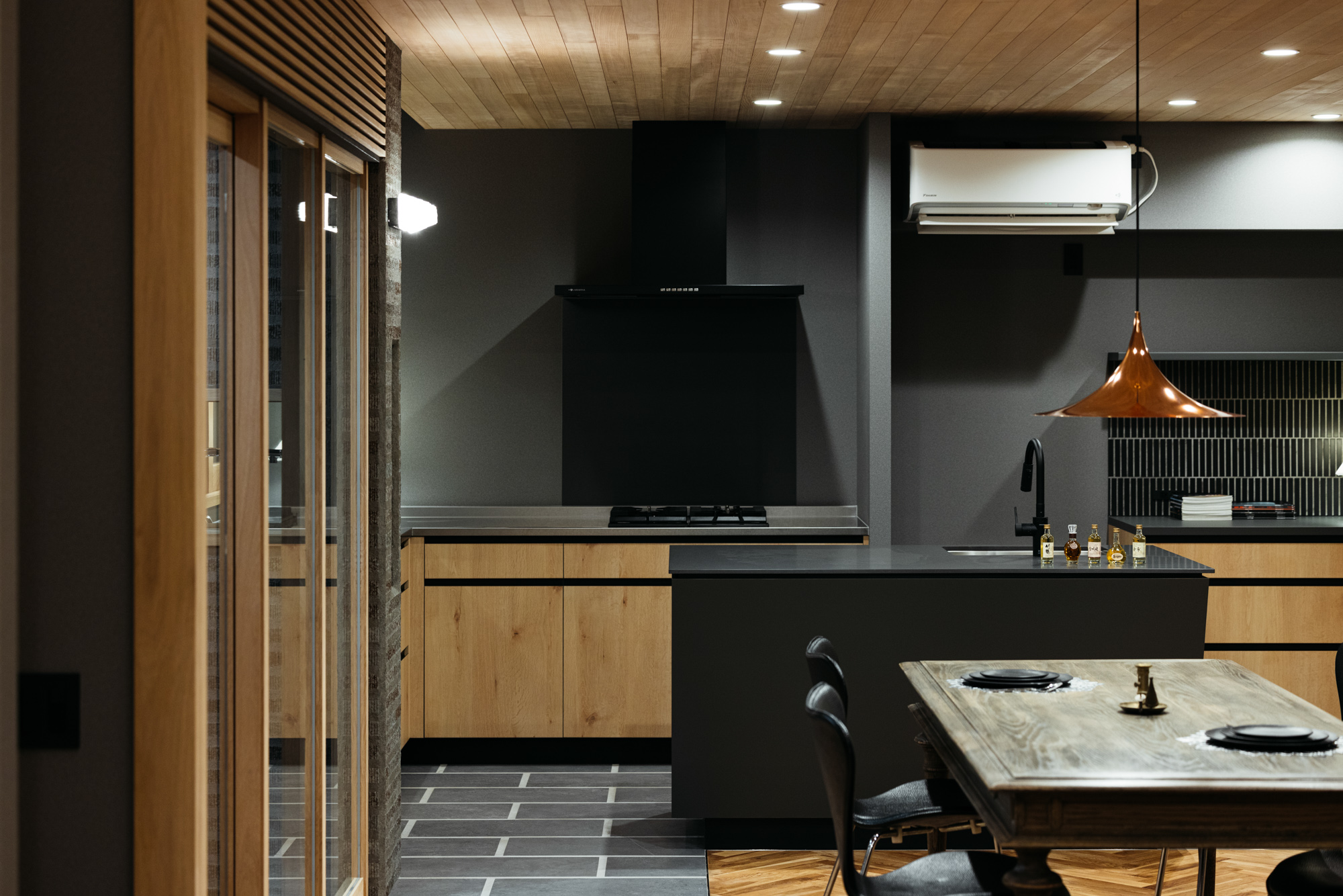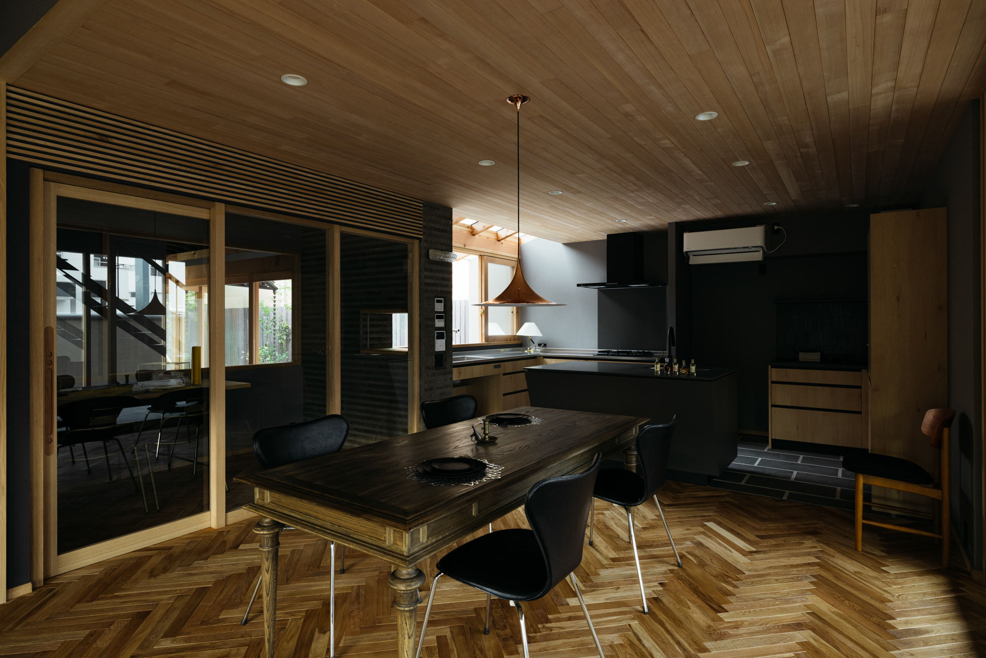 そして更に感度を上げるために床をヘリンボーンとタイルの床の組合せで天井は羽目板。極めつけはご主人が選んだダイニングテーブルとペンダント照明が見事にマッチングしています。