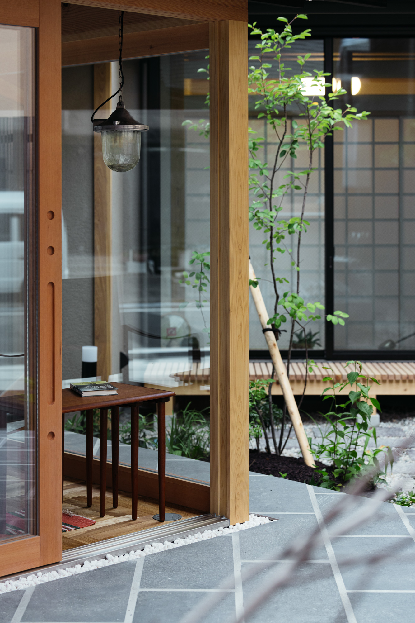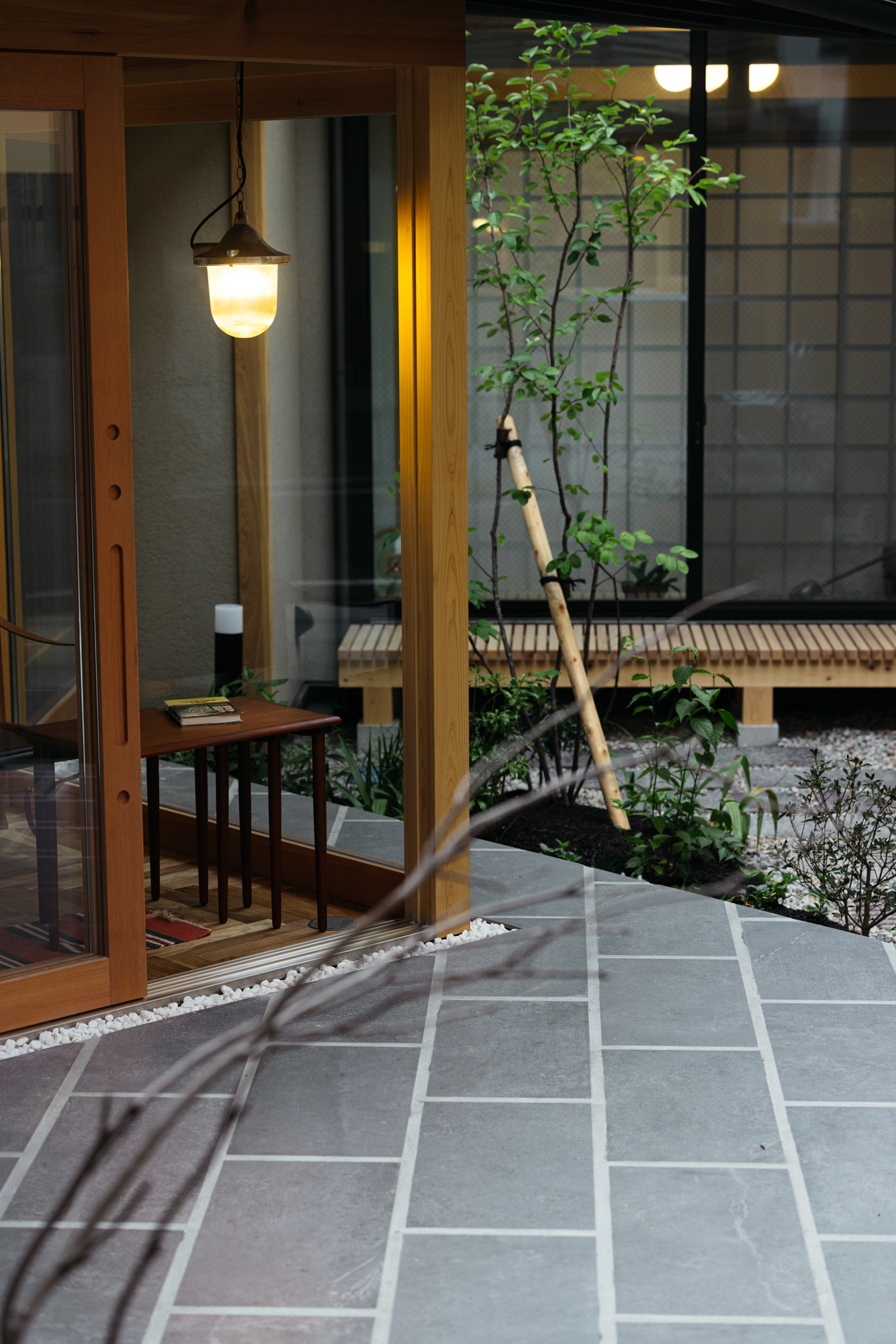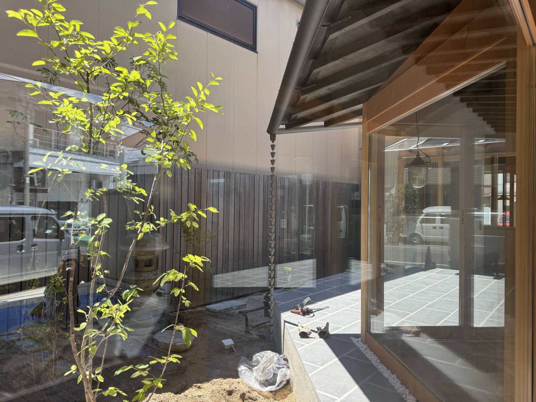 中庭では手持ちの灯篭と水鉢、踏み石をレイアウトしながらハクサンボクやジューンベリー、アオダモなどが植わってきます。はじめは少し少ないかな…と思いながらも踏み石を敷き詰めていくと程よいボリュームとなっていきます。ヌックからこの緑を眺めながらゆっくりと時間を過ごせるとても素敵な場所となっています。