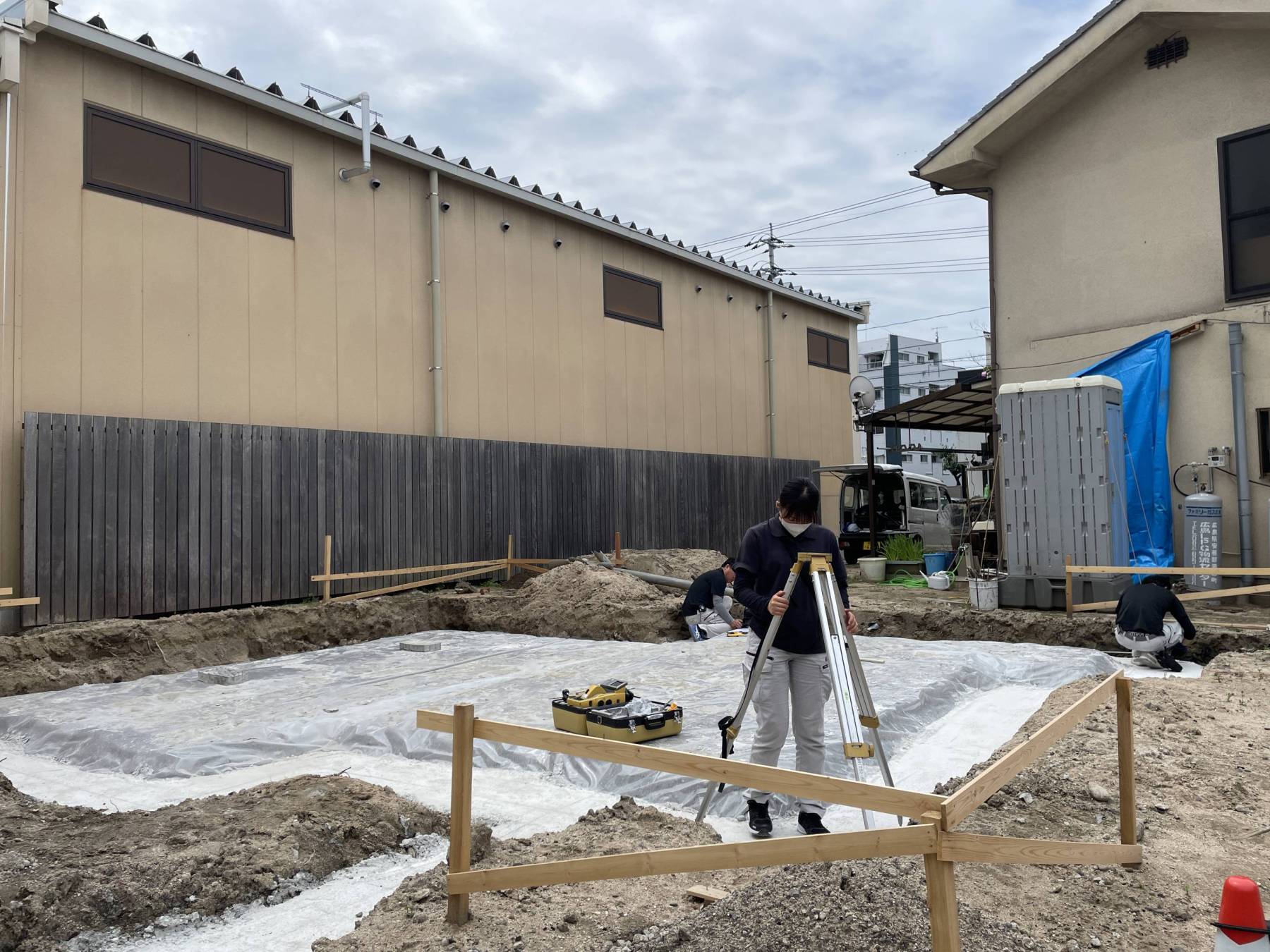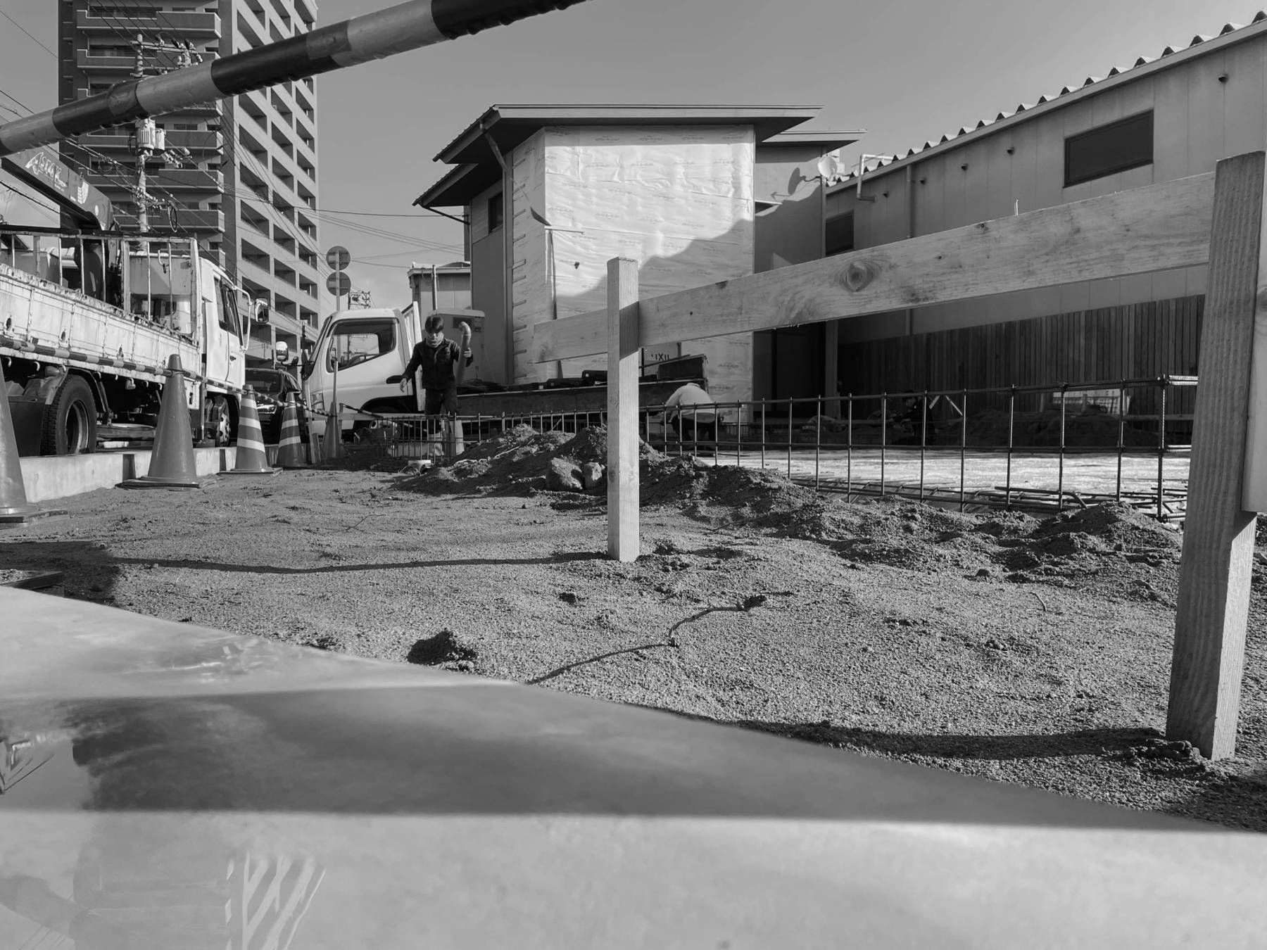 7月7日七夕一期工事棟上げに向けての広島市内で外部仕上げ再確認打合せを行いました▲現場はこれから基礎工事。真ん中にこんもり盛り上がったところは基礎スラブというコンクリート版が出来ますが、地盤からの湿気が基礎上に上がってこない様にポリエチレンシートという「防湿シート」と言われるのビニールをかぶせています。その周りの薄いコンクリートは「捨てコン」。これは構造のコンクリートではなく墨出しをするためのもので化粧する時のファンデーションみたいなもの。そして「墨出し」とは職人さんが現場で仕事をするために基準になる線で、設計図書を基に基準線を墨を付けた紐で描いていきます。地面に設計図を描くイメージです▲我々の業界はこんなに進んだ時代でも未だに昔ながらの施工方法。。。モノづくり手作りの職人の世界はずっと変わらない。変わって行かないといけないのか、変わってほしくない…そんな不思議な心境です▲20代初めのことは4H・2H・H・F4種類の鉛筆をカッターで研ぎ、和紙のトレッシングペーパーで図面を書いていた頃があります。時間はかかり間違えれば消しゴムで消してまた書直す。絶対に紙を変えて新しく書く事は許されず、書いては消しての繰り返しで同じ一枚の紙で書き上げるまでずっと使うのが基本。そんな事を繰り返しながら心身共に鍛えられた。Hなんて使わなければ楽に消せるのに…と。。。完成して印刷、といっても今は無きアンモニアの臭いが癖になる青焼きで仕上げると、Hシリーズで描いた図面はCAD図面に負けないほどのシャープな芸術的図面に仕上がる。その仕上がりを見たい為に辛さを忘れまた頑張る▲昭和かな!?多分私の年代が最後の昭和世代。これからは新しく今までとは違った価値観の鍛えられ方研ぎ染まれ方が出てくるだろう・・・見てみたい▲それでも「葉音の暮らし」は昭和感覚で創り込んでみたい