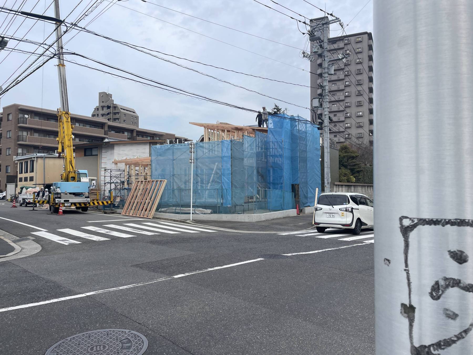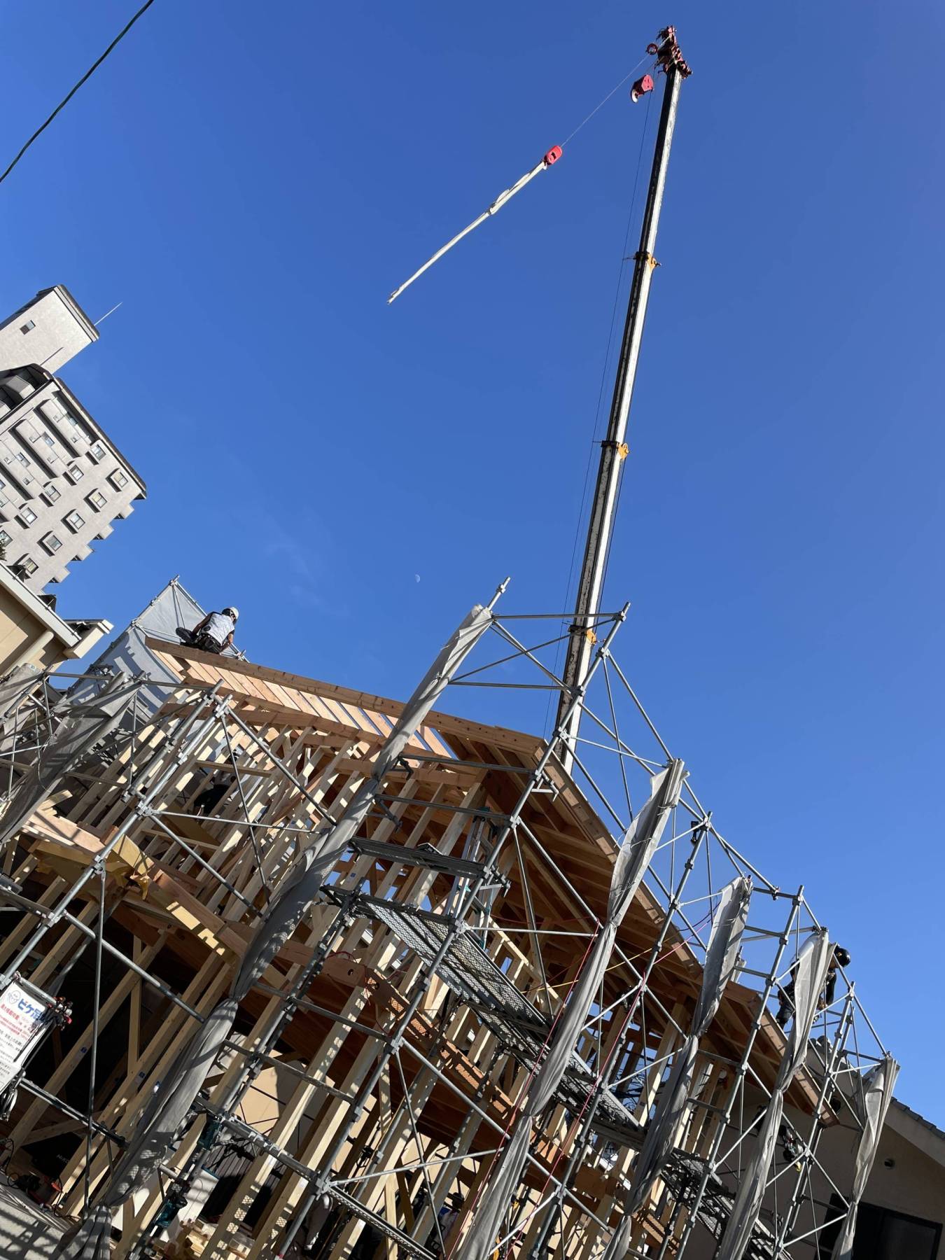広島西区にて棟上げを行いました▲今回は住みながらの二世帯住宅の為、1期工事2期工事と二回に分けて一年かかりの大工事▲庇を通常よりも長く出したことによって優美な佇まいのシルエットが見えてきたことが嬉しかった一日▲でももう一ついい気持になったのが・・・↓