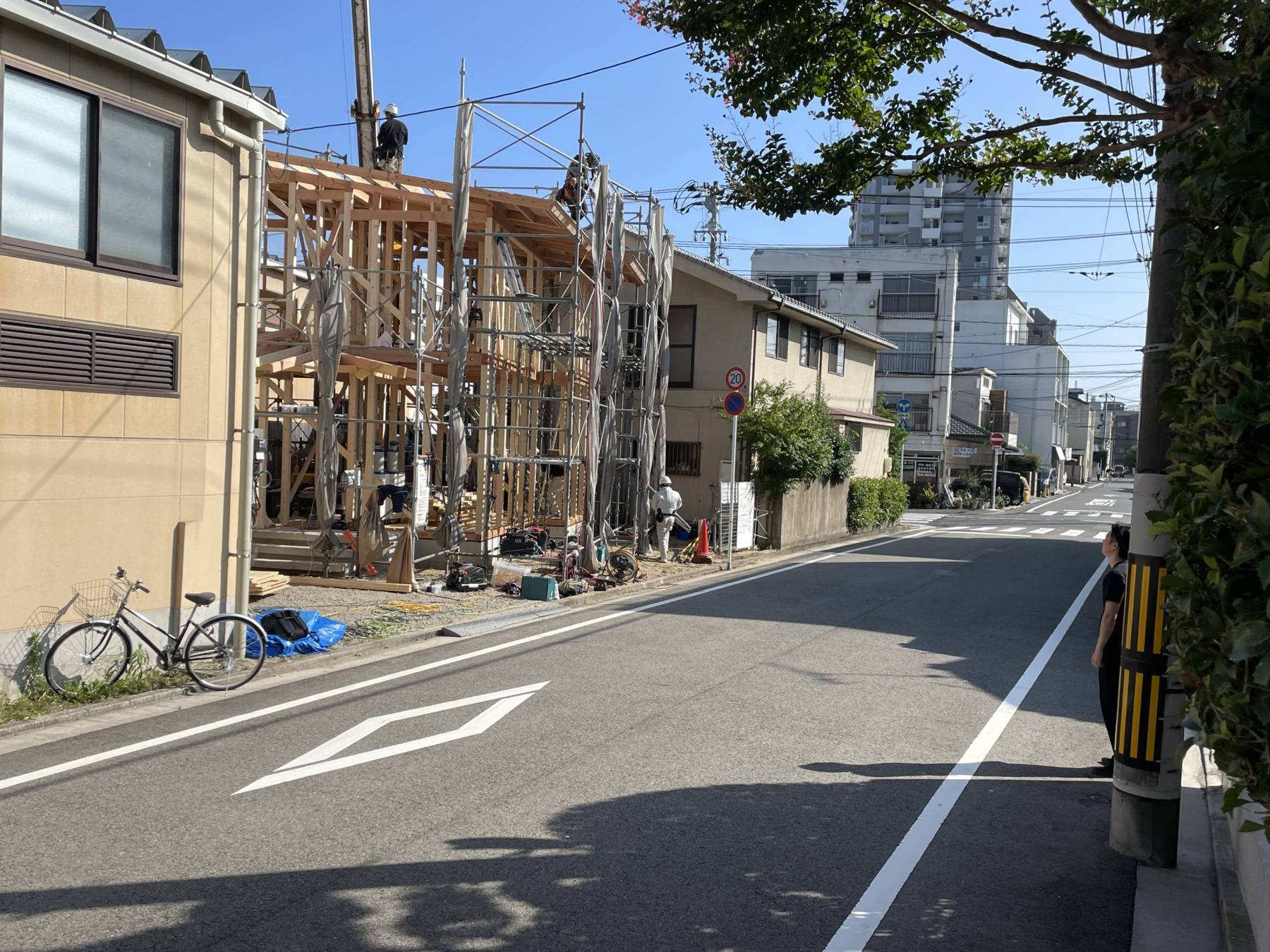 広島西区の三瀧荘隣で棟上げが行われました。随分と書き直したプロポーションが実際どうなっているのかドキドキしながら現場を訪れると・・・よしっ!思った以上に奇麗なプロポーションとなっていてついついうれしくなり顔がほころんだ自分がいました。片流れ屋根は簡単そうですごく難しいんですよね。。。あとは塀の高さを決定すれば整います。自分自身が納得できたとても奇麗な住宅です。