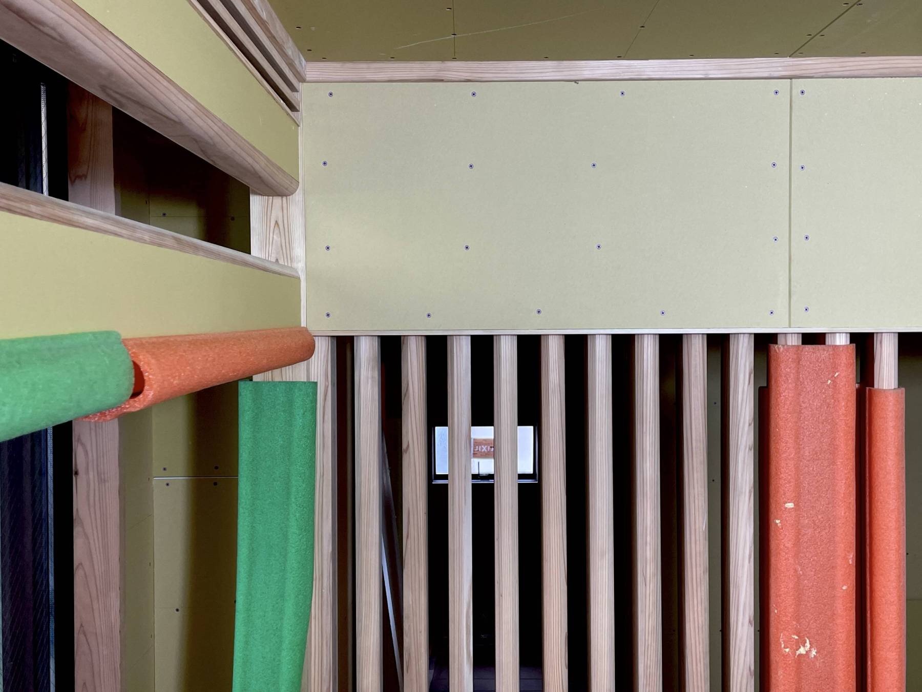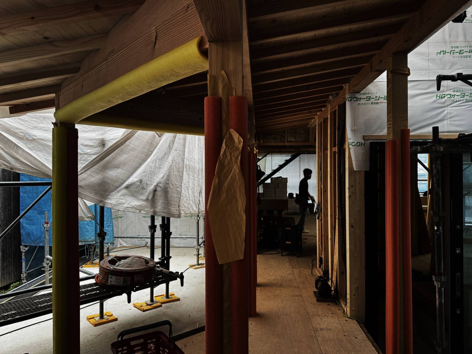 まだまだ仕上げ前の現場ですがとてもいい空間ができることがすぐ想像できる現場に内心顔がほころびます。お客さん支給品の照明器具の取付位置も微調整の指示をして、色塗り分け部の確認など微調整微調整で整えていきます。このヌックがある廊下空間もいい感じです。設計の時かなり悩み続けた結果が形に表れているのがうれしい。