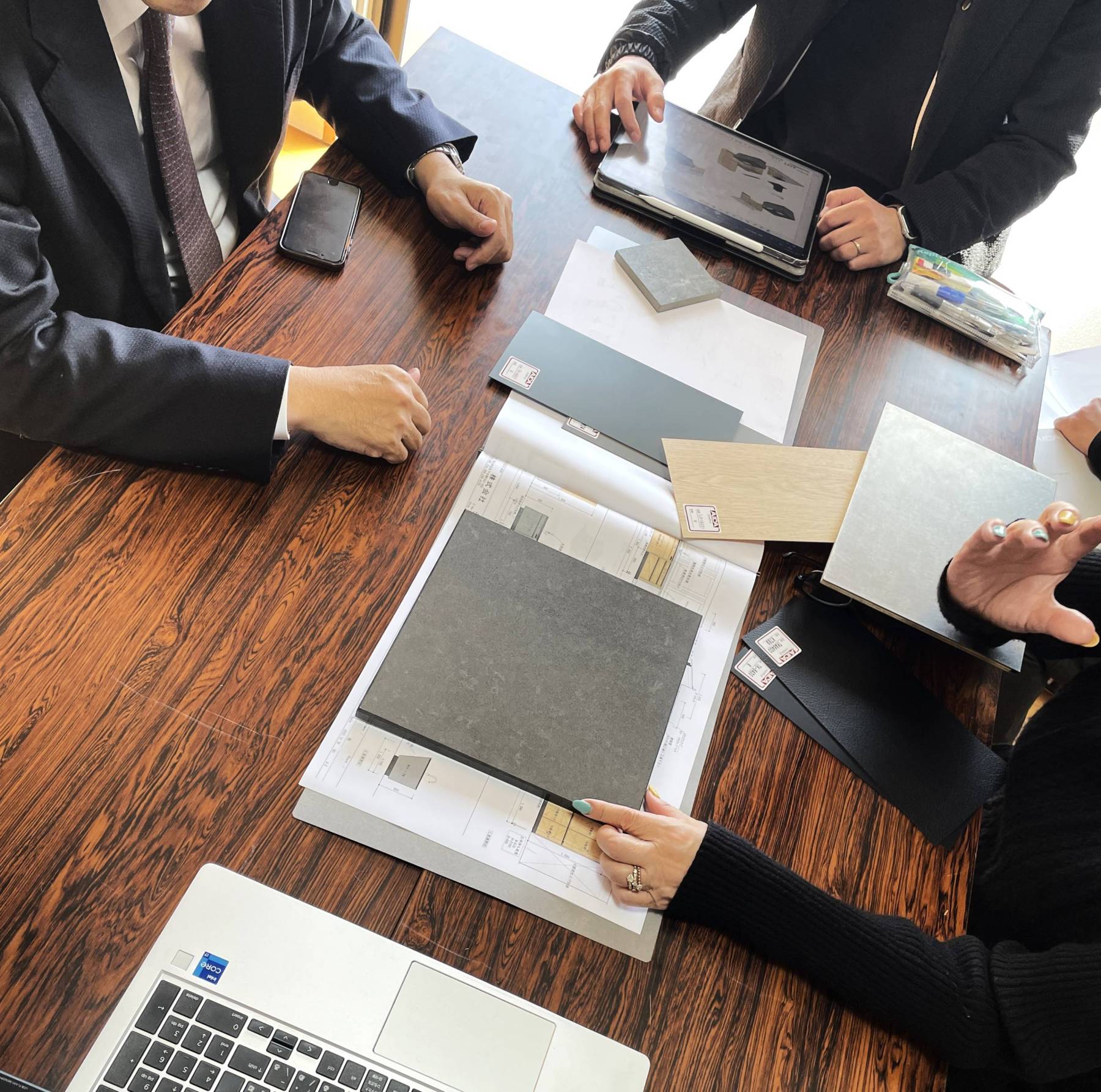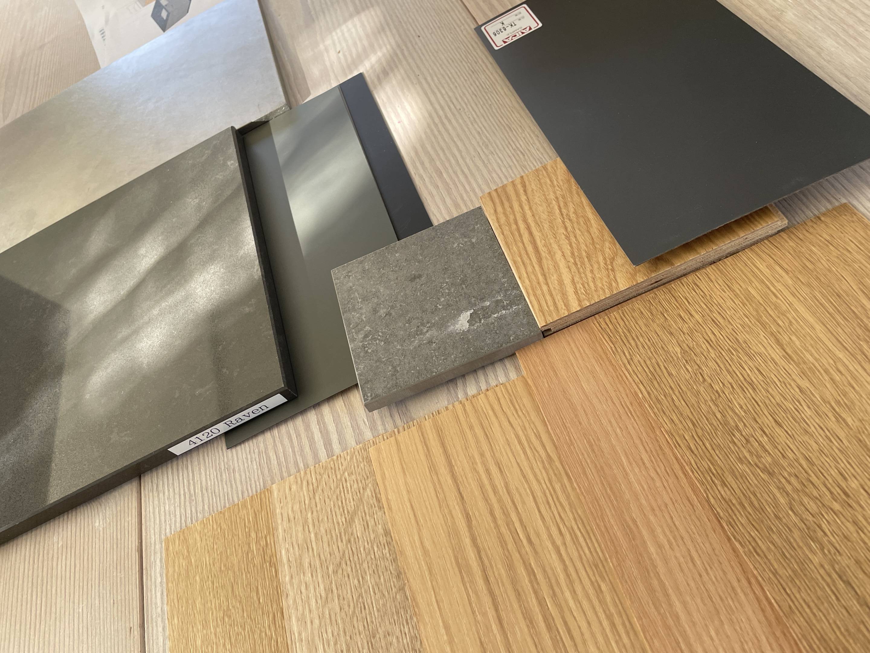 オーダーキッチン最終色合い決定の社内mtg▲オーク、タモのインテリアの中に野暮ったくならないように黒と灰のコントラストをつけて引き締めていきたいと思い、濃灰の組合せを入れ替えながら決定していっています▲人工大理石の灰色とタイルの灰色、化粧板の灰色それにステンレスと黒をオークに組み合わせて渋いキッチンを組み立ててみました▲今回のキッチンは中庭を見ながら家事ができるように窓際に設置しながら、家族と暖炉に向かってパーティーシンクの付くアイランドを設けています▲来年のXmasにはご家族5人とおじいちゃん一緒に楽しくキッチンにたてることができそうです。そして暖炉にはどんなスープが暖められているのでしょう!?とても素敵な家族の風景が想像できます▲今お住まいの場所で最後のXmasをお過ごしくださいね。メリークリスマス♪