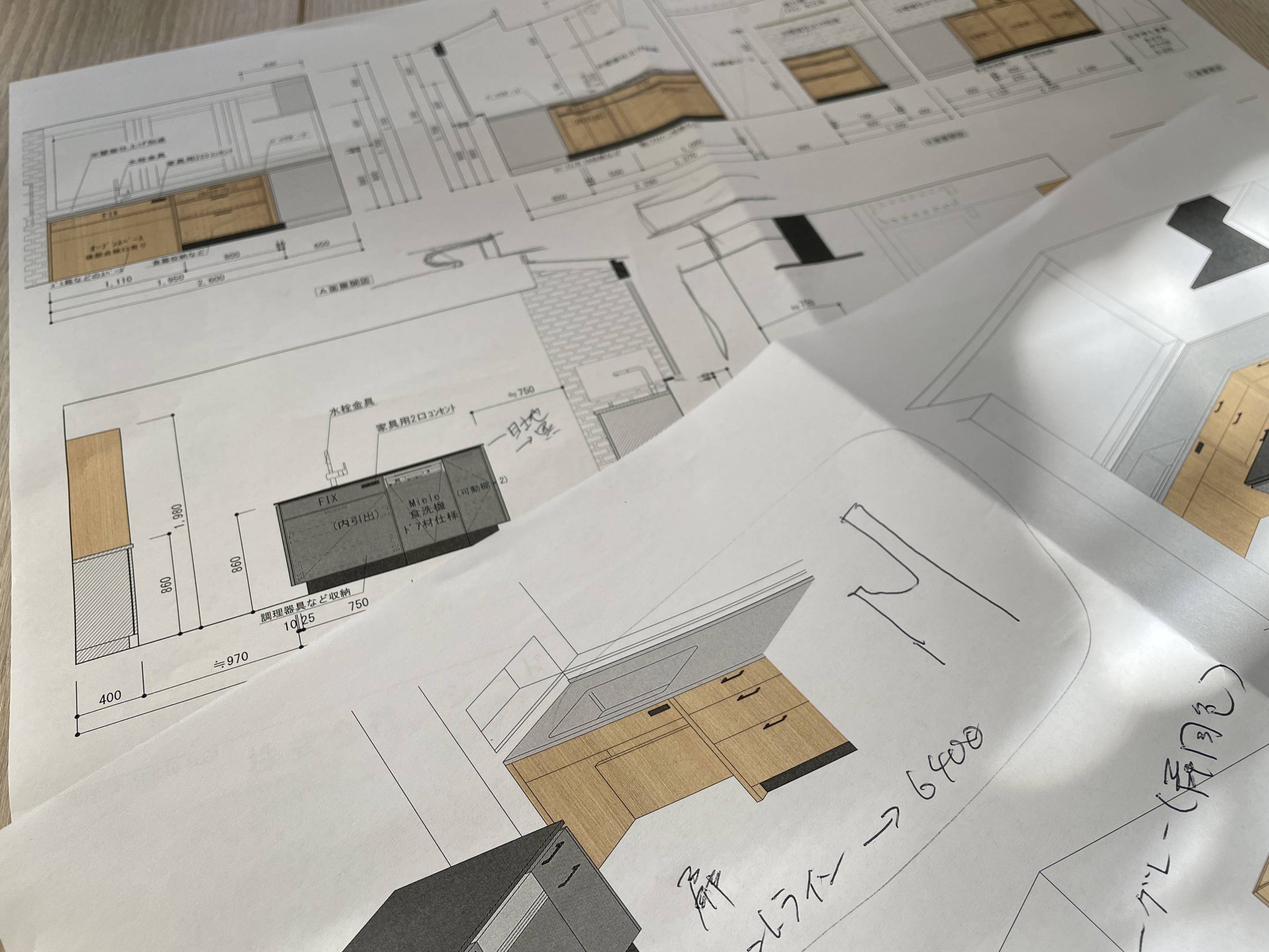 現場はいよいよそろそろ仕上げの大詰めに入ってきました。久しぶりに老眼鏡をかけてキッチン周りの木製建具詳細を書いてみました。出来るだけスタッフに任せ図面は書かないようにしているのですが、久しぶりに書くと面白く止まらない…ついつい予算以上のことを。工務店さんすみません。。。