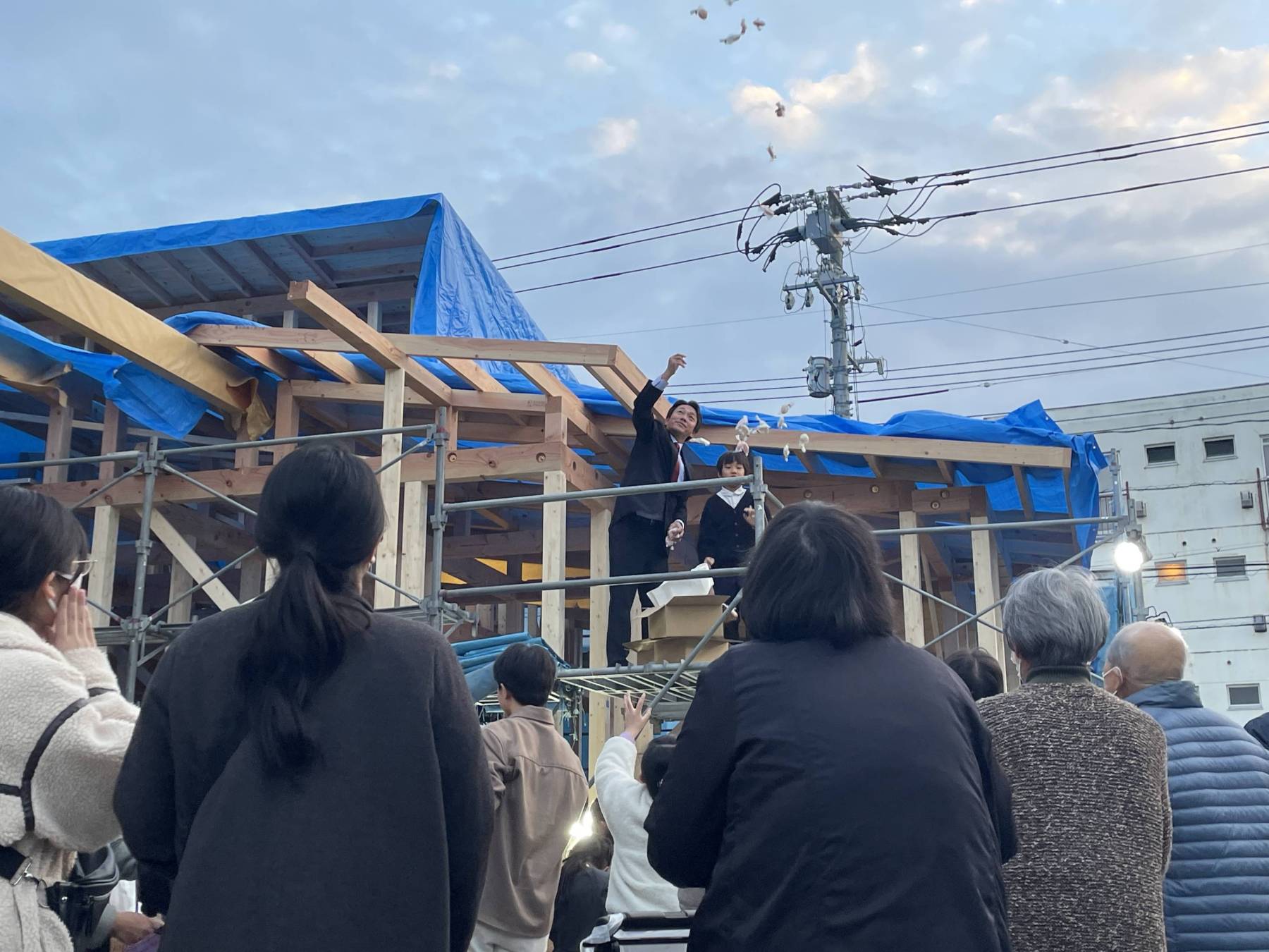 そして最後は餅投げを行いました。ご近所さん数人の予定でしたが、あれわあれはとどこで聞きつけたのかぞくぞくと集まり想定の10倍位集まってくれて「ちょっとお餅が足りないかも・・・」の一言で急遽コンビニでお菓子をチャーターしてもらったのですが、子供たちは正直でお菓子が投げられた瞬間今までなかった瞬発力で凄い取り合いに!お菓子の威力はすさまじい・・・。
