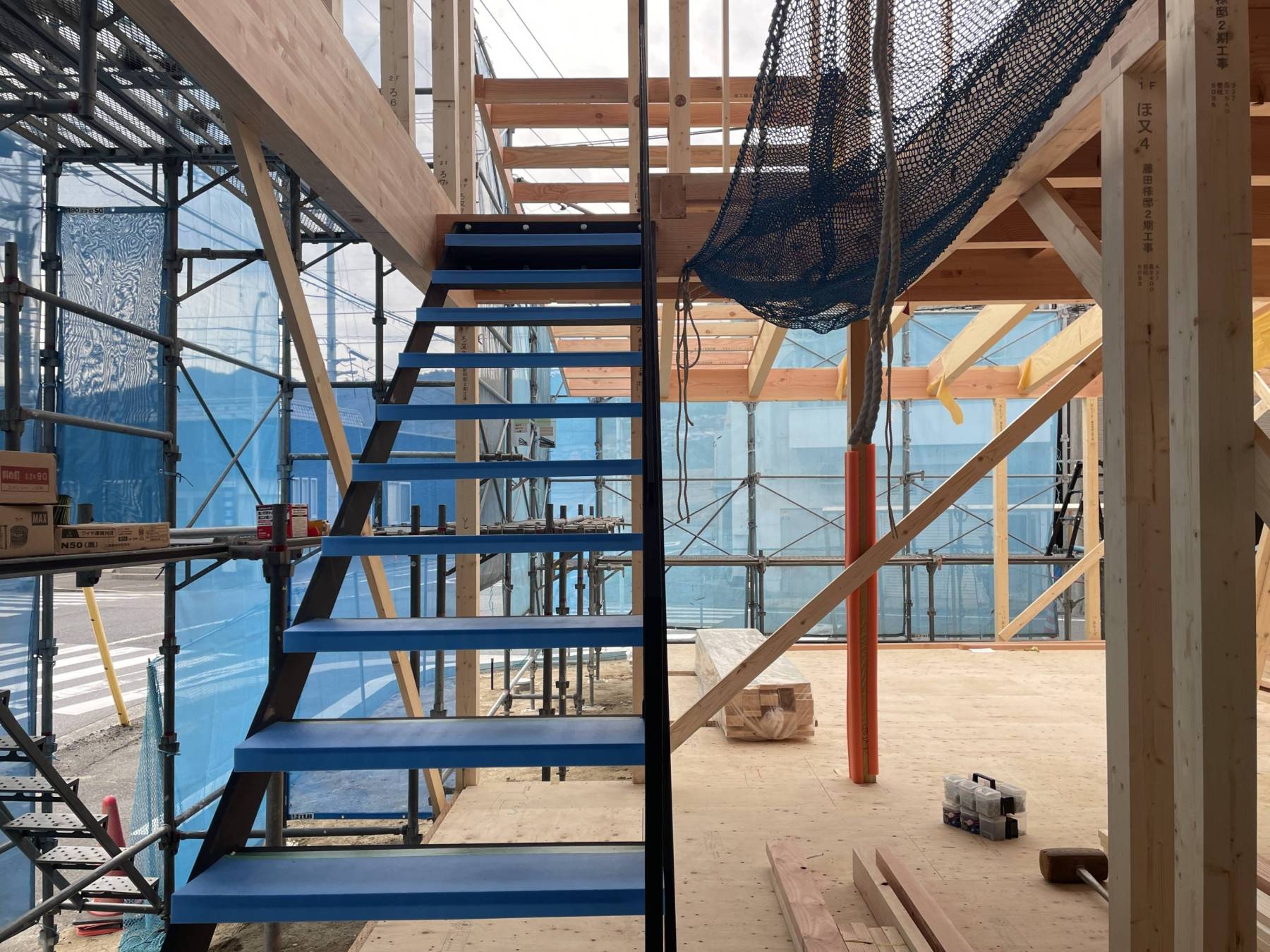 そして内部には最後まで変更し続けた鉄骨階段が設置されました。現場監督さんにはぎりぎりまで何度も変更して申し訳なかったですが、手すりを止めるボルト一つまで変更してしまいました。今回は6角穴あきボルトを使用しています。そして手摺はオークを少し浮かせてみせる小技が!!!完成が待ち遠しいです。