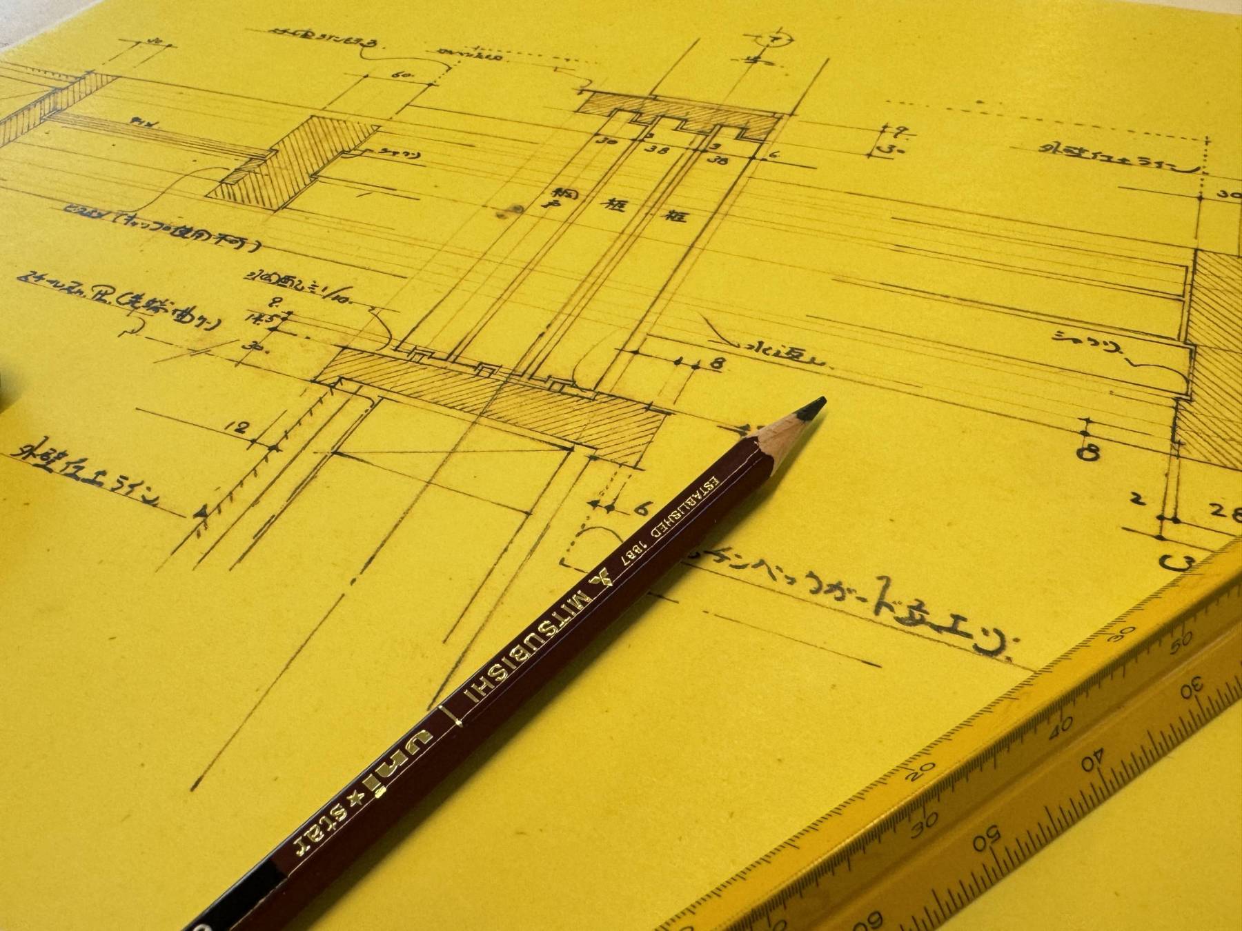 現場に提出する和室の詳細図です。老眼鏡が手離せません。。。▲設計図では納まりきっていない詳細なミリ寸法を整理しながら・・・やはりだめですね~。。。書き始めるとついついあれもこれもとデザインしてしまい、棟梁に怒られそうです▲現場監理での楽しみの一つはディティールを詰めて設計よりも感度を上げていく事。これが楽しくこれが創っていっている感がやめられない▲久しぶりに手を動かしてみてやっぱり設計が楽しい。そんなひと時でした。