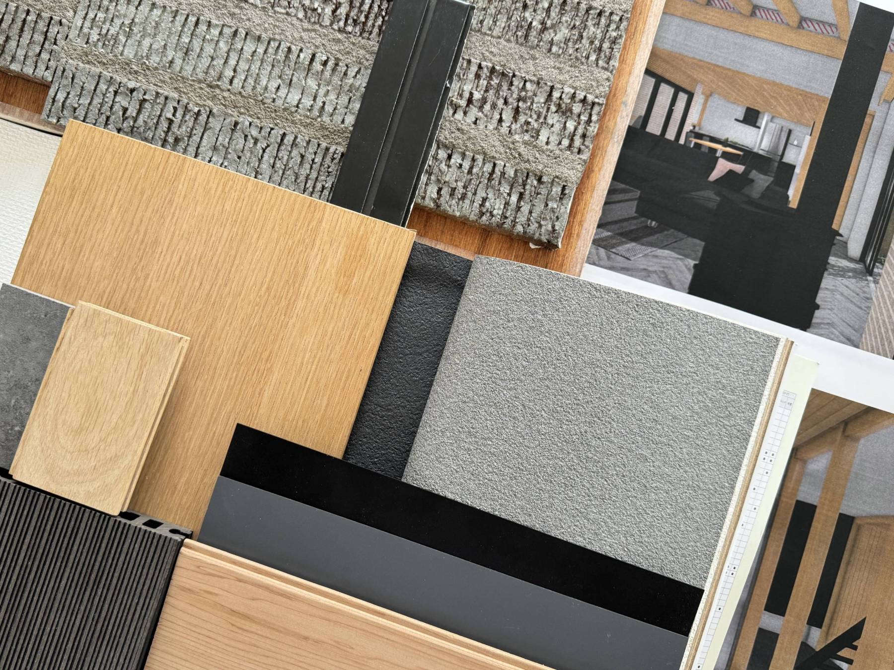 オーク材を基調とした落ち着いた色彩にまとめていく為何種類かの色の組合せを繰り返して事前決定していきます。急遽初めて使う壁紙サンプルを取りにサンゲツまで久しぶりに行ってきました。そして整った色彩バランス。ここからどこにどの素材を使うかを決定していきます。イメージするのは昼間自然光だけの陰影シーンと夜暖色系の明かりが灯された時です。事務所の照明をつけたり消したりして疑似体験をしいざ出陣!!!