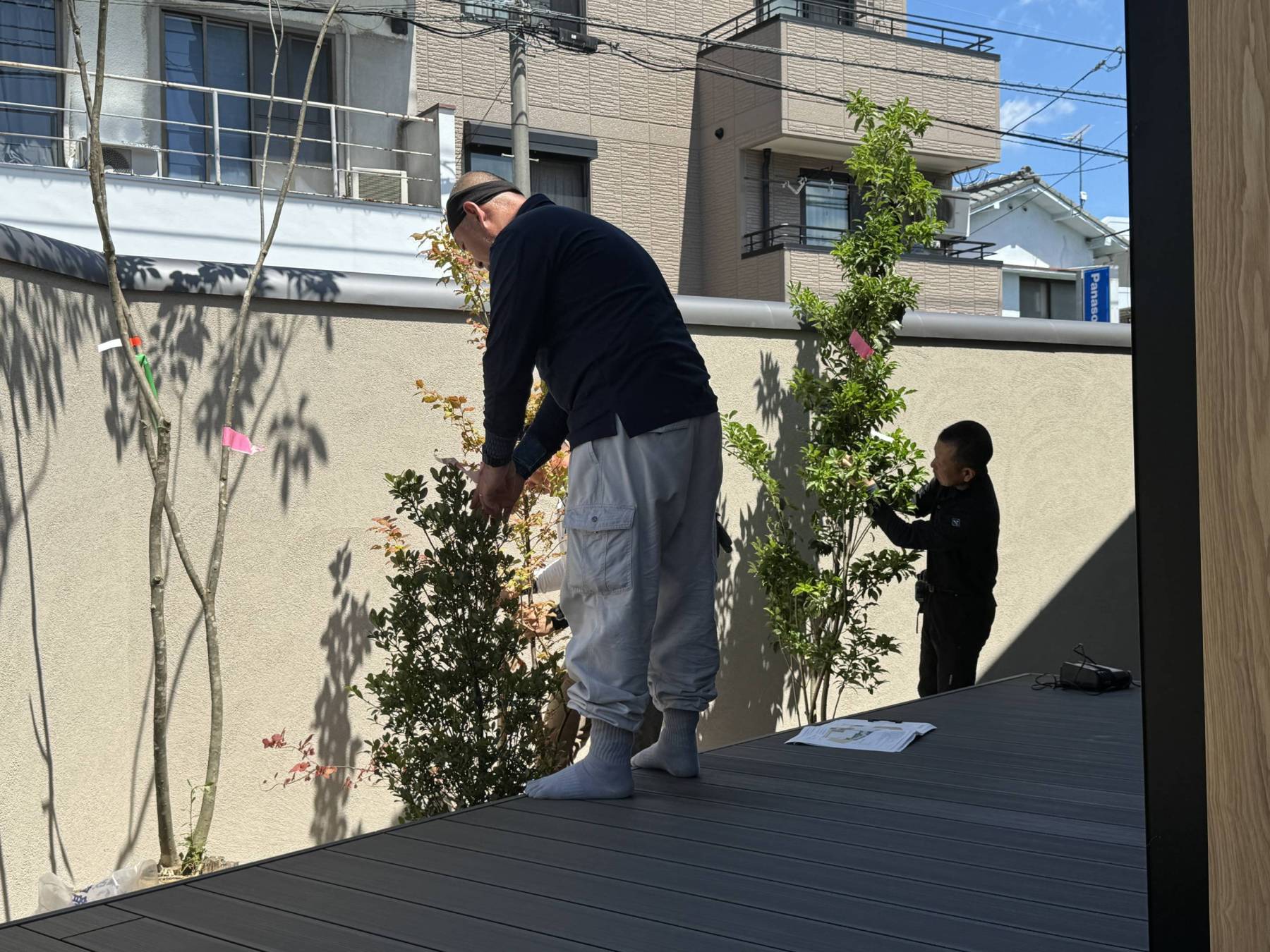昨日は最終調整で植栽の位置を決めました。塀の向こうに見える標識は緑が茂れば見えなくなるように。設計を変更してソヨゴと常緑ヤマボウシを入れ替え、ナツハゼとシャリンバイとほかの植栽とのバランスを親方が微調整しています。これらはこれから成長し茂り紅葉し10年後立派な庭になっている子tでしょう!