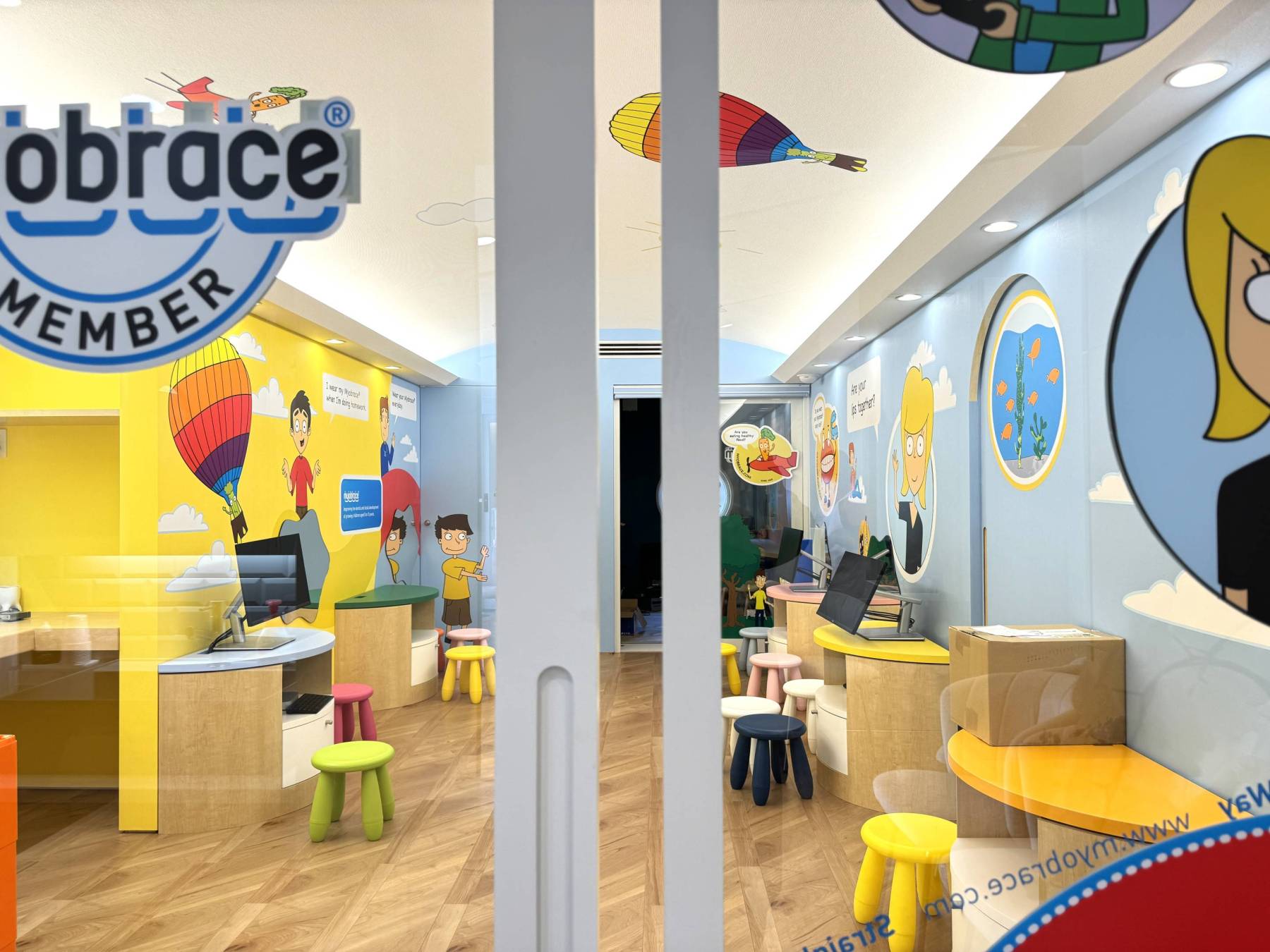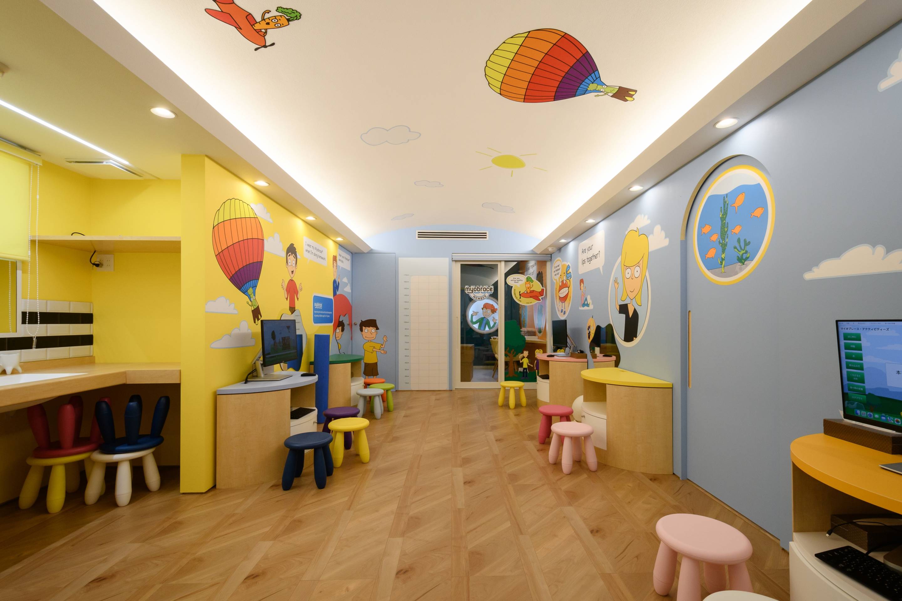 そして一番の目玉はアクティビティルーム!マイオブレース???あまり聞きなれないですが、5歳からの歯を抜かない子供の為の矯正治療の事です。歯並びが悪いと、子供がコンプレックスを抱えてしまう・・・。そして虫歯になりやすく発音が上手くいかないなどなどの悩みを解決する場所です。子供目線から見ると怖い歯医者さん!それを少しでも和らげるためにカラフルな色とキャラクターをたくさん使って楽しく子供たちが学べる場所にしました。そして閉鎖的にならないように明るく開けた空を建築で表現したかったためR天井に間接照明を灯し表現してました。ここで成長期にマイオブレース矯正をすれば自然に変化し、永久歯が生える前に骨の中で歯の位置を整え、その結果顔立ちが良くなり呼吸がしやすくなる。だから、正しい鼻呼吸が身に付き全身健康になれるから良い睡眠が取れ思いっきり学校生活が楽しめる。というすべてが一連のプラススパイラルに連結します。