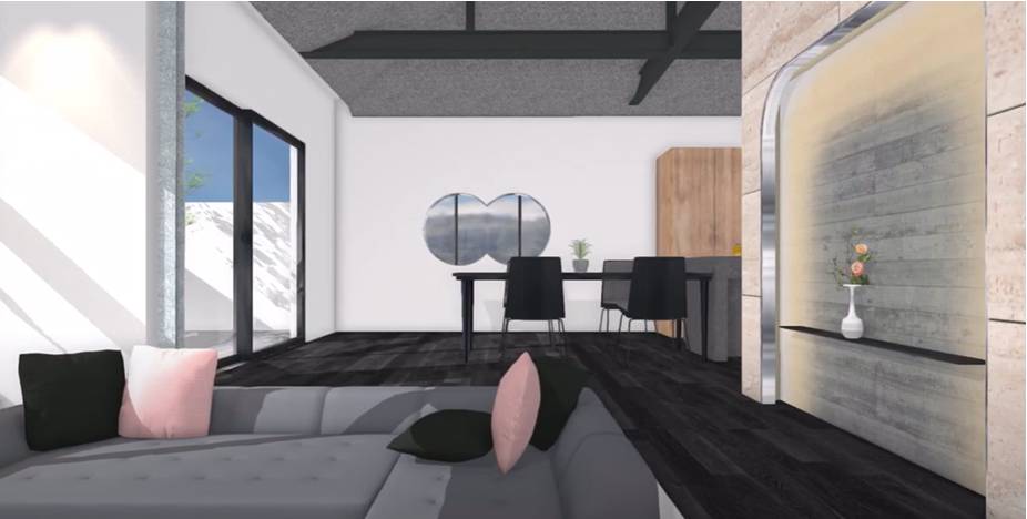 このような完成イメージになります。飾りで窓を残したままデザイン開口でシンボル的にして、リビングはピットリビングに変更。そして寄棟の特徴を生かして二階が無い平屋部分は屋根なりに吹き抜けにしてみました。壁はトラバーチン(大理石)と間接照明+コンクリート壁、アクセントにステンレスを取り入れてインテリア性を持たせてみました。ここまで変われば想像もしなかった変化にリノベできて完成が楽しみになります。