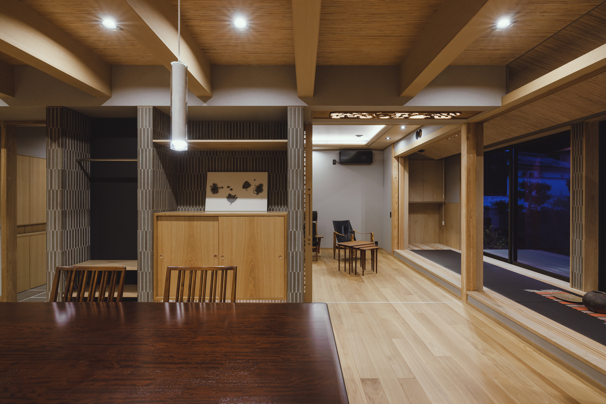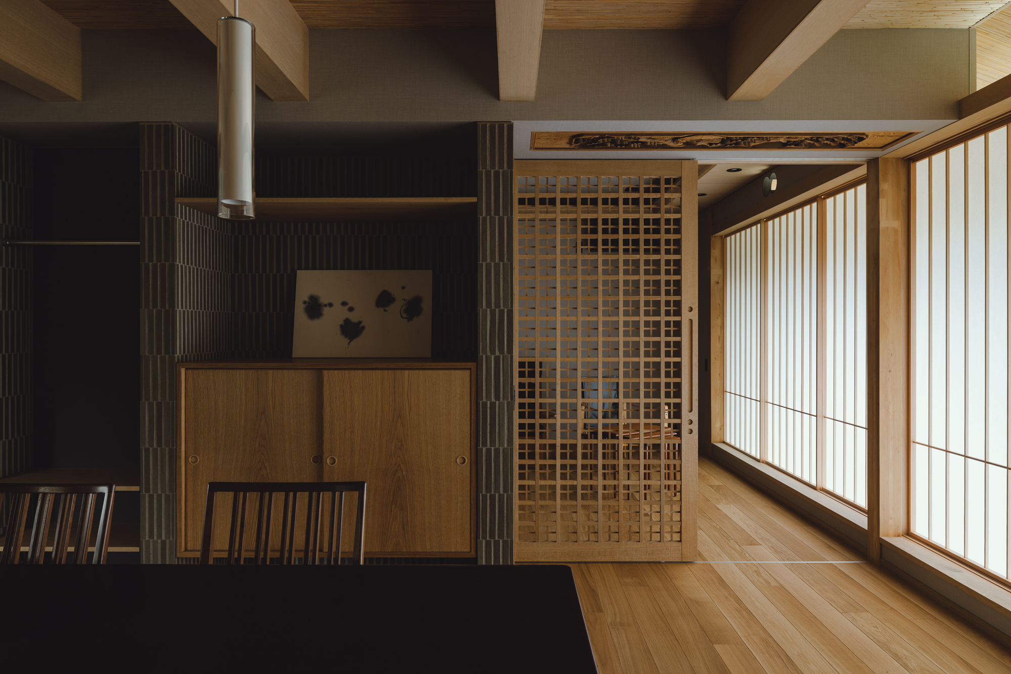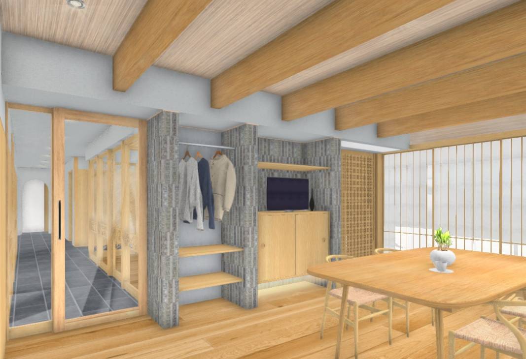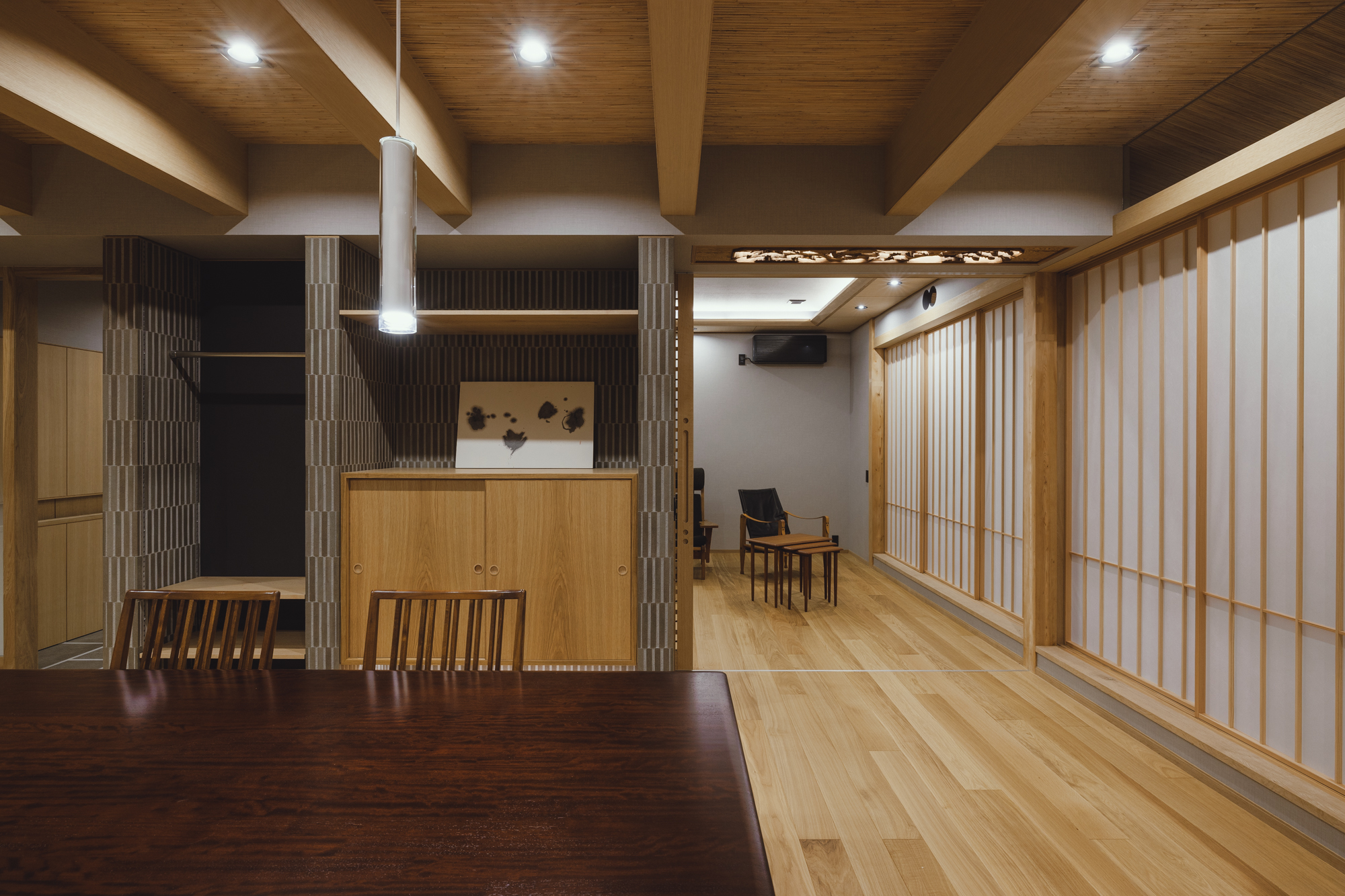 メリハリの付いた空間となり障子と格子がより似合うDKに。壁面にはオークの隠し扉で雰囲気を壊さないように、リビングとの境にはタイルを張った収納スペースでお孫さんたちが帰ってきてもカバンや服が乱雑しないように、障子は全開できて開放すれば庭のデッキとつながるようにと色々な仕掛けを施します。障子をかけるとこんな雰囲気です↓↓↓