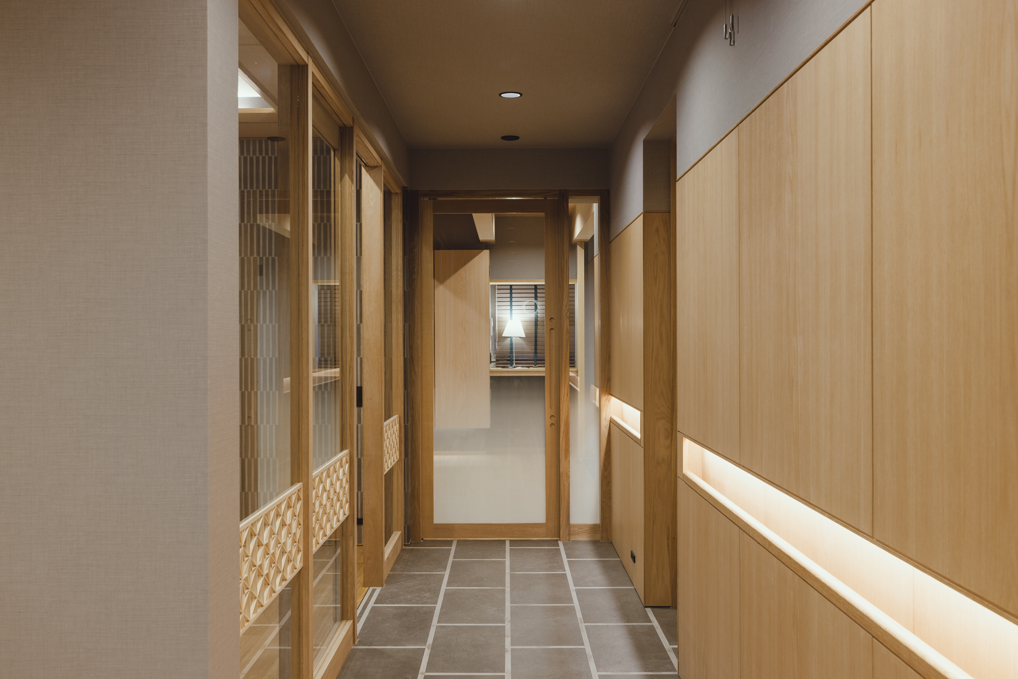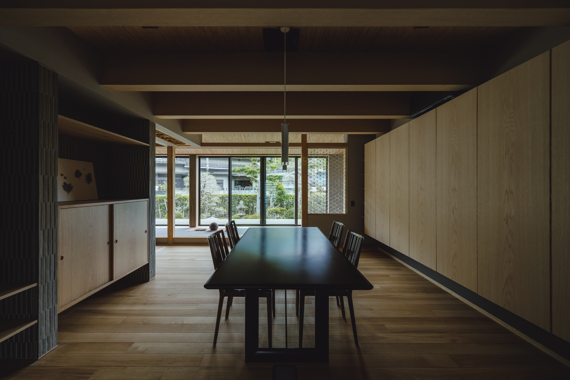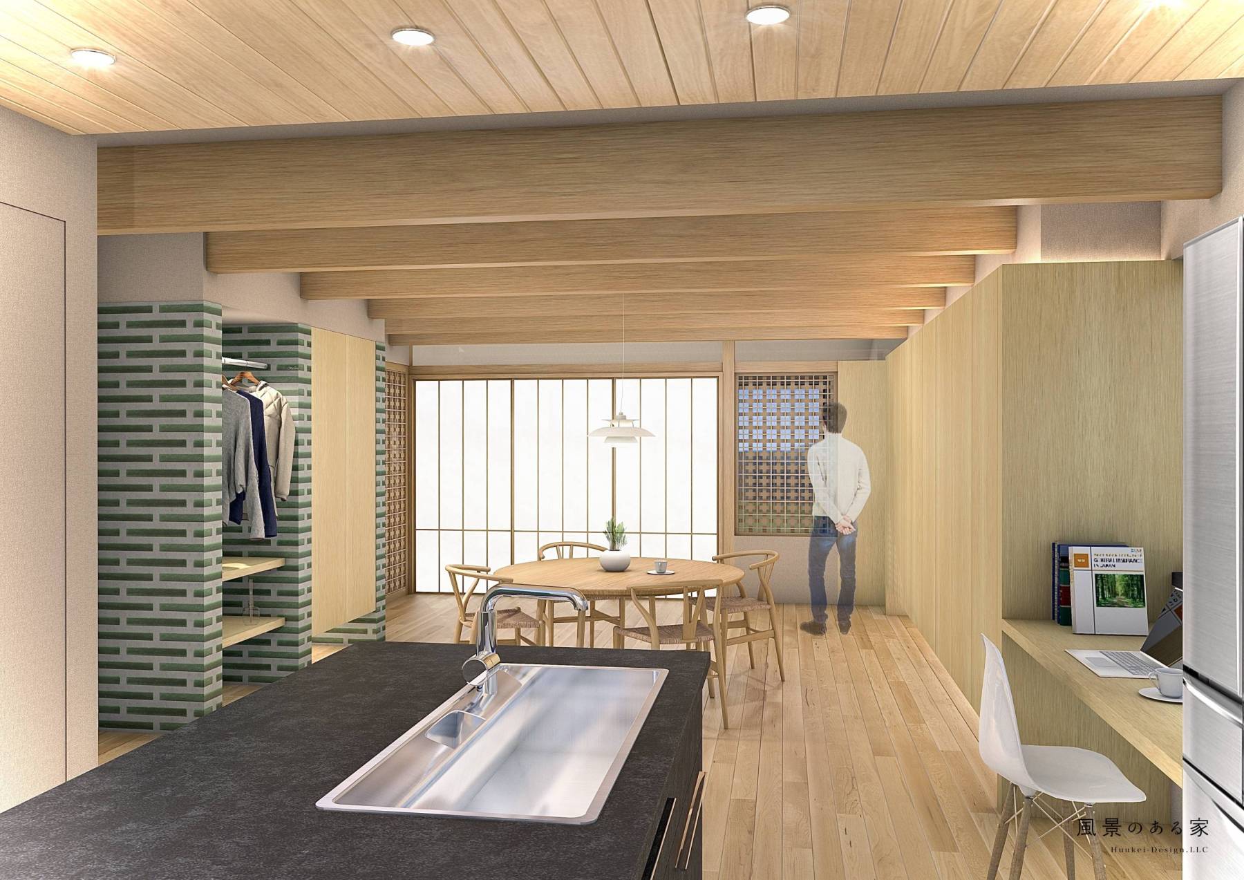 メリハリの付いた空間となり障子と格子がより似合うDKに。壁面にはオークの隠し扉で雰囲気を壊さないように、リビングとの境にはタイルを張った収納スペースでお孫さんたちが帰ってきてもカバンや服が乱雑しないように、障子は全開できて開放すれば庭のデッキとつながるようにと色々な仕掛けを施します。障子をかけるとこんな雰囲気です↓↓↓
