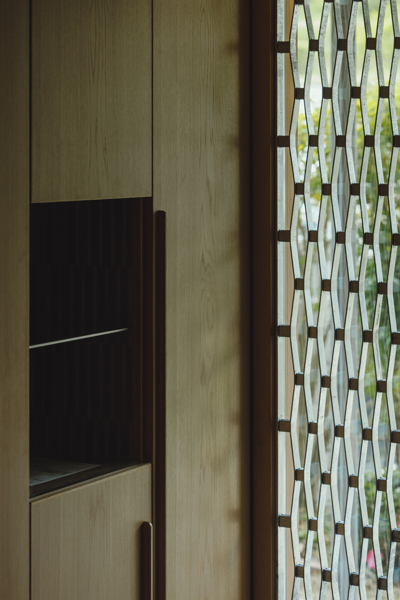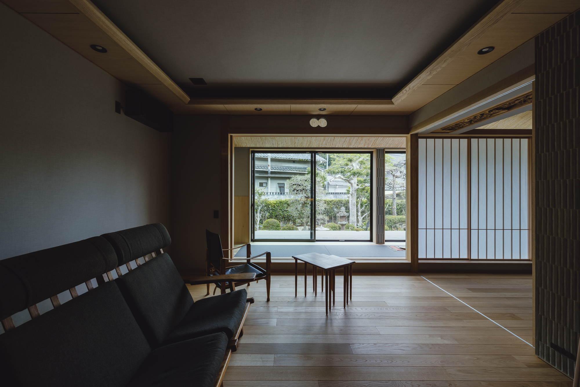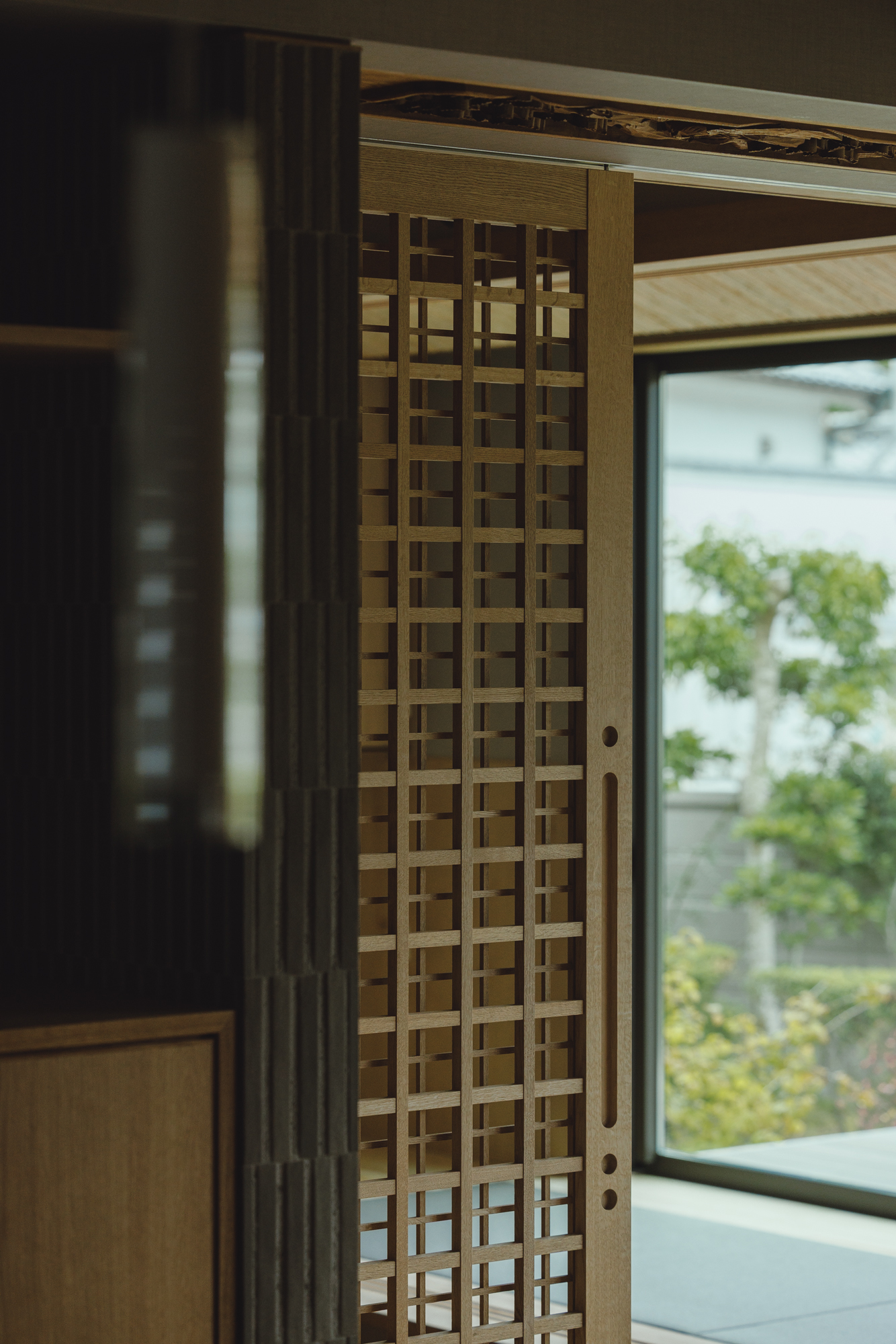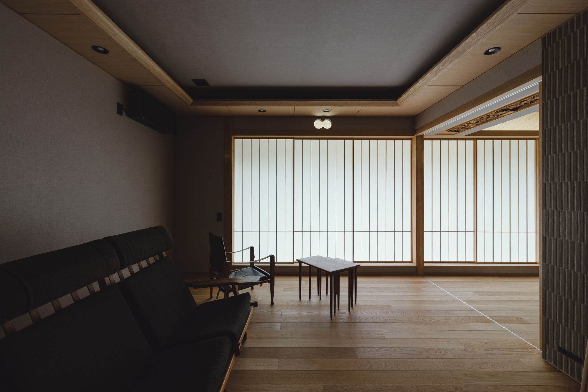 メリハリの付いた空間となり障子と格子がより似合うDKに。壁面にはオークの隠し扉で雰囲気を壊さないように、リビングとの境にはタイルを張った収納スペースでお孫さんたちが帰ってきてもカバンや服が乱雑しないように、障子は全開できて開放すれば庭のデッキとつながるようにと色々な仕掛けを施します。障子をかけるとこんな雰囲気です↓↓↓