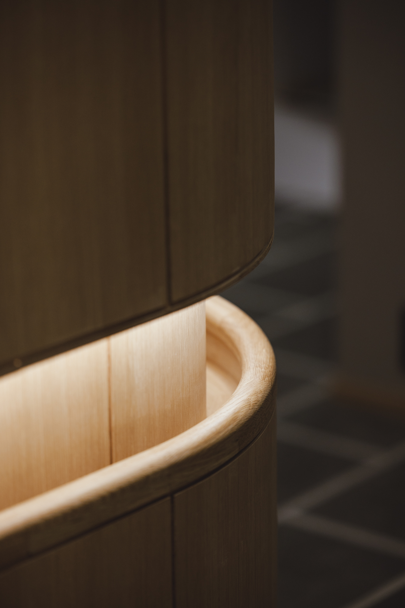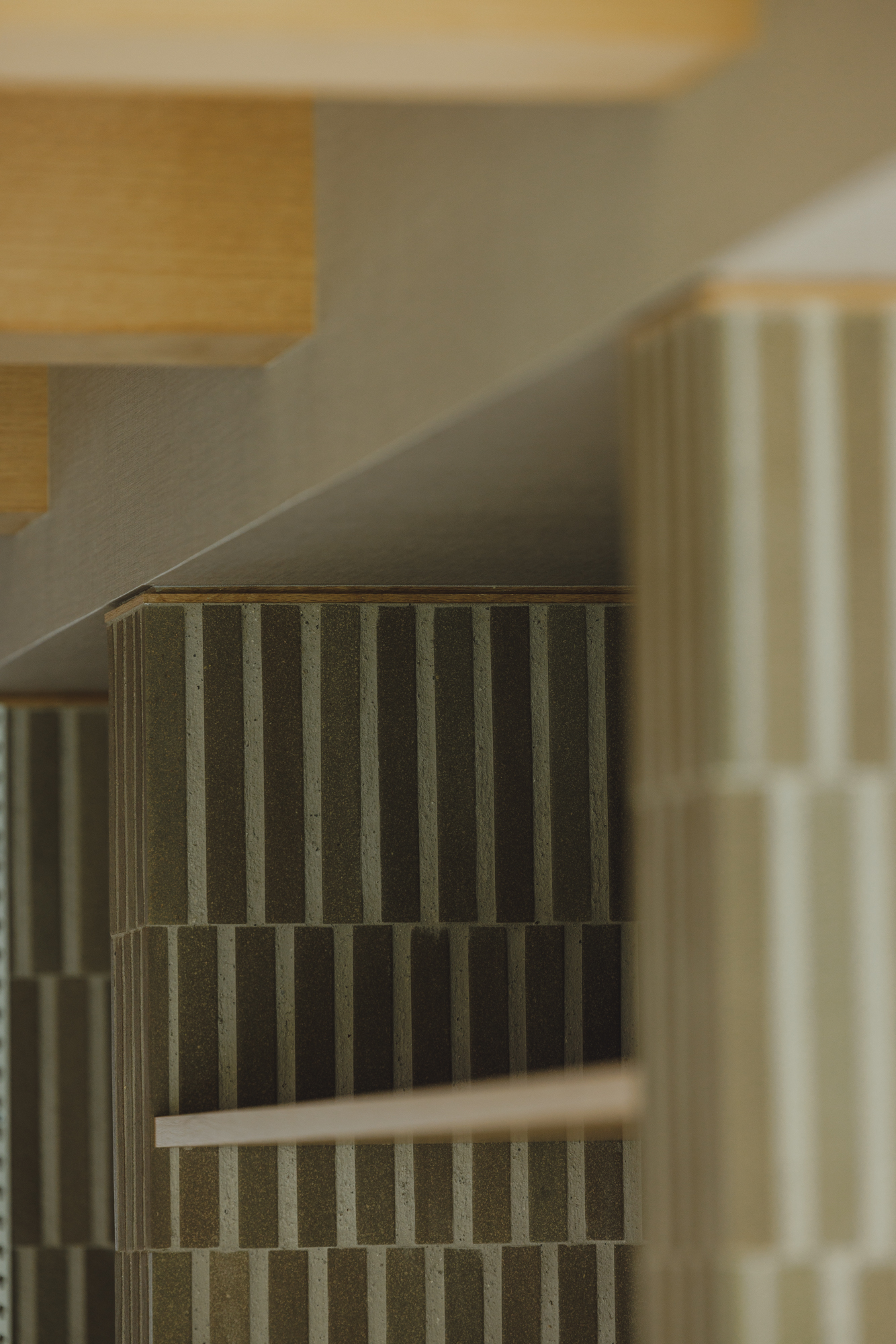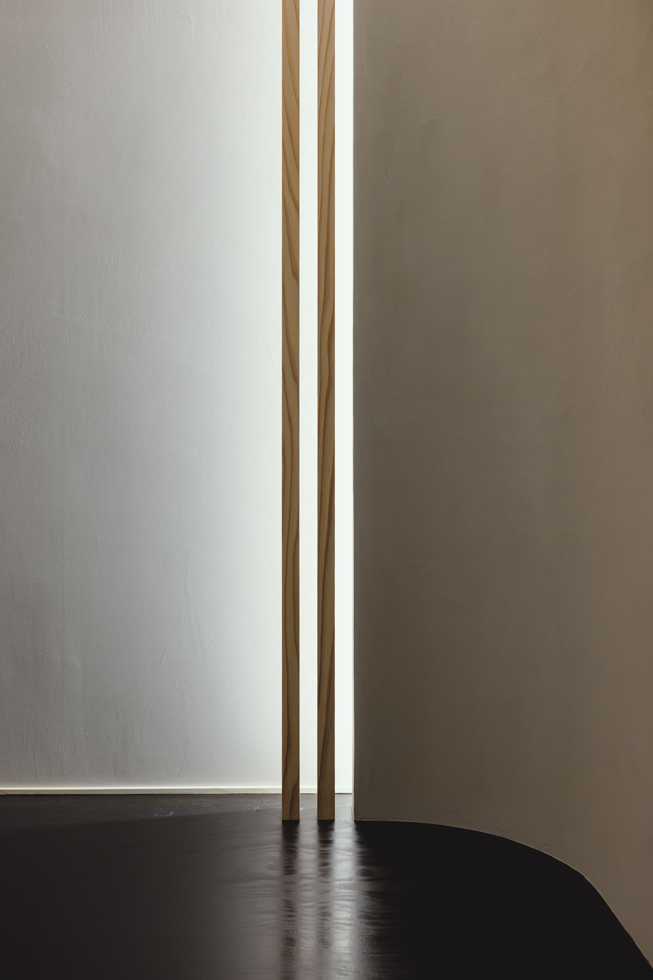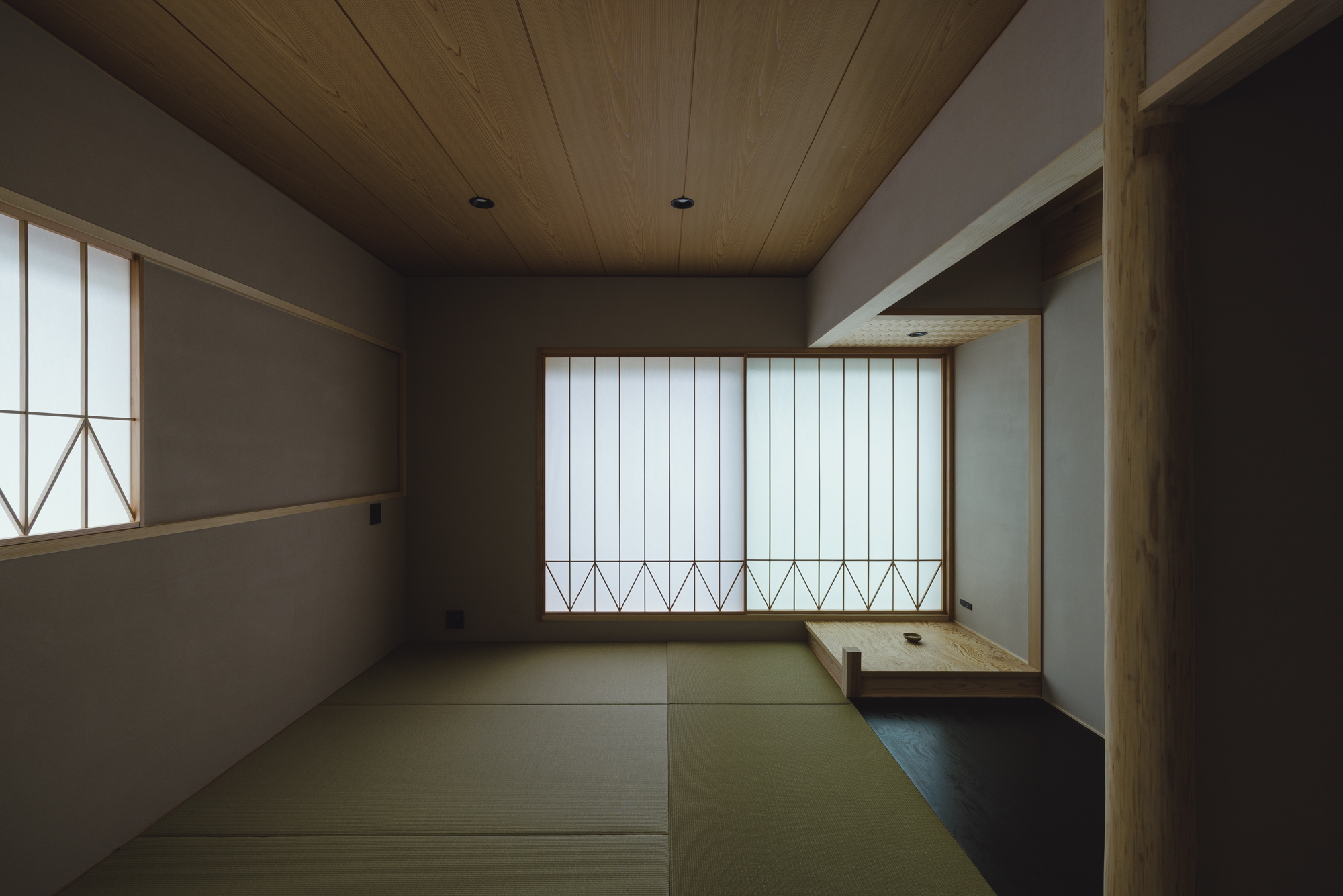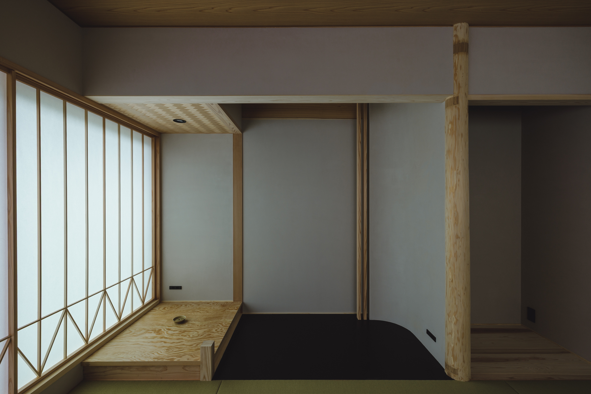 北から南へ風と光が抜けて気持ち良い設計なっています。そして帰省した時に過ごせるゲストルームの和室も設けています。既存続間で使っていた柱を再利用してみました。この和室のプロポーションとしては少し太すぎるのですがそれ以上に記憶を残すということでは適切かと思い採用させていただきました。ゲストルームということもあり琵琶床に間接照明ですこしあそび心でしつらえてみました。更に子の和室の入口はとても小技が多く集まっていて貫や曲線、漆喰の塗り回しなどたたみ一畳の場所に多くのデザインを聞かせています。