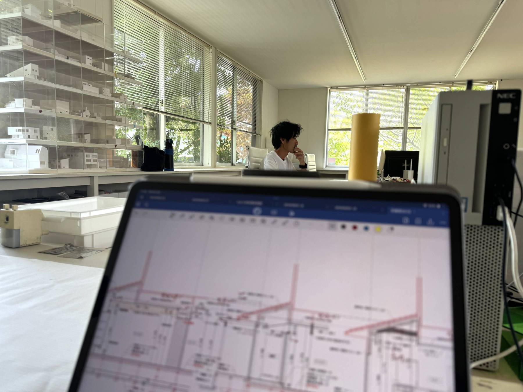 社内ではというと、設計UP前のチェックがなかなか終わらない…。図面を見るたびにやっぱりここは・・・色合いもなんとなくイメージしながらちょっと変更したり・・・ディティールをつくってみたり・・・ここまでするならここも・・・んんん~・・・もう一息・・・多分・・ん?